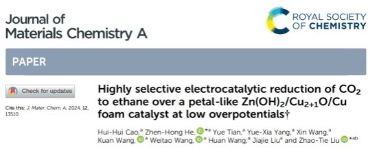 此外,開發(fā)了一種構(gòu)建Cu2+1O電催化劑的策略,通過Zn(OH)2穩(wěn)定Cu2+1O,在泡沫銅上形成片狀結(jié)構(gòu)的Zn(OH)2/Cu2+1O催化劑,實(shí)現(xiàn)電催化CO2還原為C2H6在低過電位下(-0.3?-0.6V (vs. RHE))產(chǎn)生較高的法拉第效率(在-0.3V下,產(chǎn)生C2H6的法拉第效率高達(dá)67.8%),且該催化劑可以連續(xù)應(yīng)用至少三天,具有可接受的電催化性能。相關(guān)研究工作以“Highly selective catalytic reduction of CO2 to ethane over a petal-like Zn(OH)2/Cu2+1O/Cu foam catalyst at low overpotentials”為題發(fā)表在Journal of Materials Chemistry A(IF=10.8)期刊上,該研究對(duì)電催化CO2還原產(chǎn)生C2H6提供了一種新的策略。我校博士研究生郭攀攀、曹會(huì)會(huì)為第一作者,何珍紅教授和劉昭鐵教授為共同通訊作者,陜西科技大學(xué)為第一通訊單位,陜西師范大學(xué)為共同通訊單位。