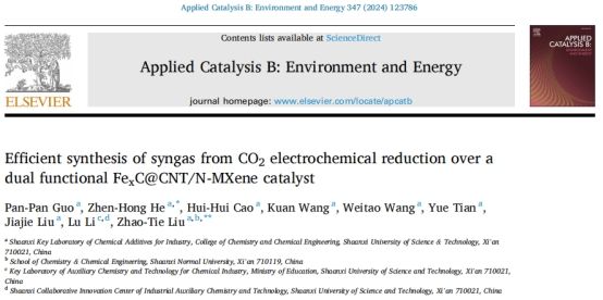 圍繞CO2資源利用,采用熱解法制備了FexC@CNT/N-MXene催化劑,用于催化二氧化碳和水共電解生成CO和H2。通過調(diào)節(jié)外加電位,產(chǎn)生具有不同H2/CO摩爾比的合成氣,其中在-1.1 V (vs. RHE)獲得等量的CO和H2,可直接用于氫甲?;虵T合成等反應(yīng)。表征結(jié)果表明,在制備過程中形成了FexC、碳納米管和摻雜N的MXene。本研究為CO2ER和HER共電解合成氣提供了一種高效的催化劑,該策略對(duì)設(shè)計(jì)其他偶聯(lián)反應(yīng)的雙功能催化劑提供思路。相關(guān)研究工作以“Efficient synthesis of syngas from CO2 electrochemical reduction over a dual functional FexC@CNT/N-MXene catalyst”為題,發(fā)表在Applied Catalysis B: Environment and Energy(IF=20.3)。