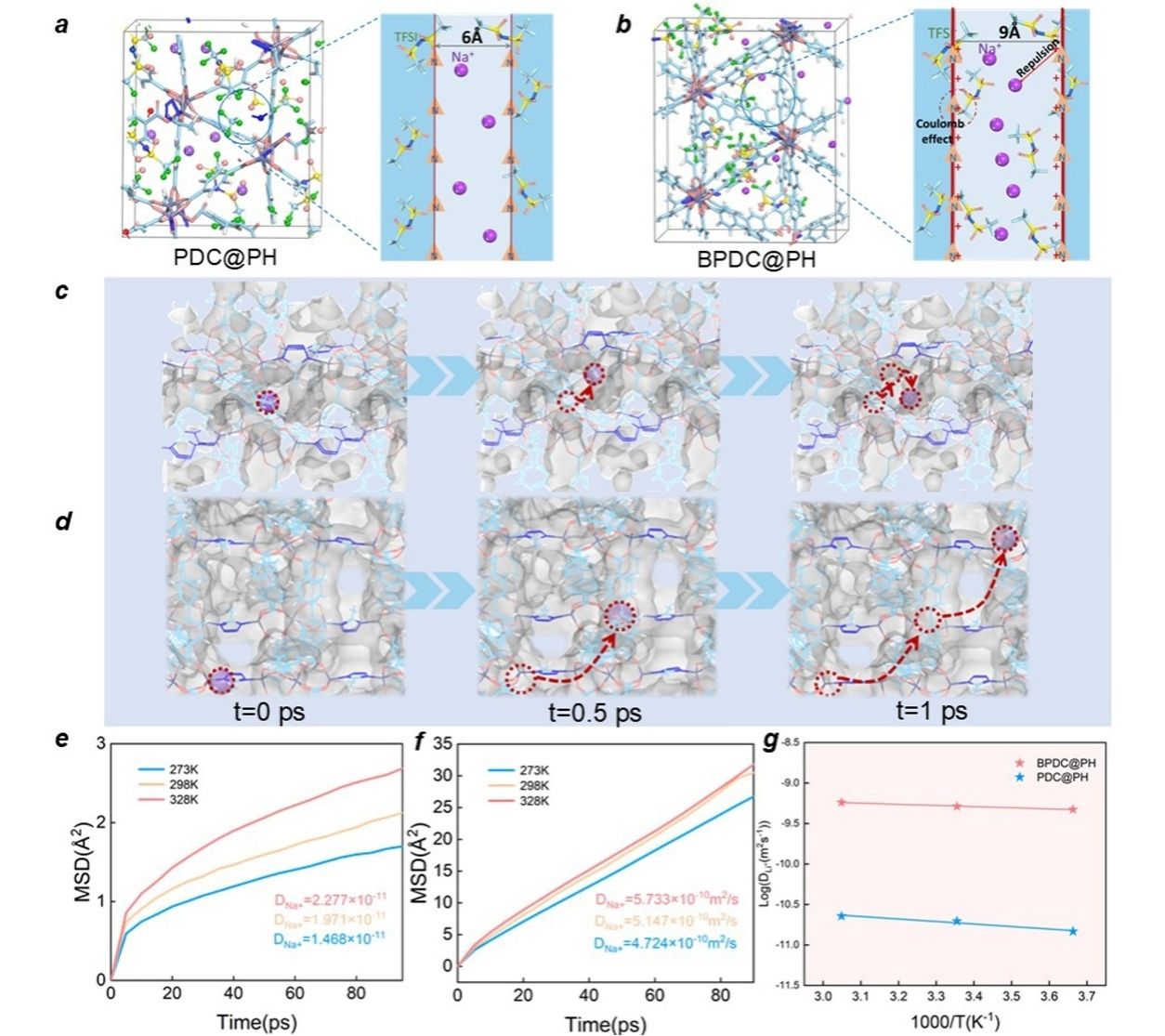 1. 精準設計MOF孔道,實現(xiàn)離子高效傳輸。通過調(diào)控配體長度形成孔徑分別為6 ?和9 ?的一維通道。其中,BPDC@PH電解質(zhì)憑借更大的孔道(9 ?)及孔壁靜電吸附特性,顯著優(yōu)化了鈉離子(Na?)擴散路徑,并選擇性吸附陰離子(TFSI?),使離子遷移數(shù)提升至0.87,電導率達7.74 × 10?? S cm?1(35°C)。