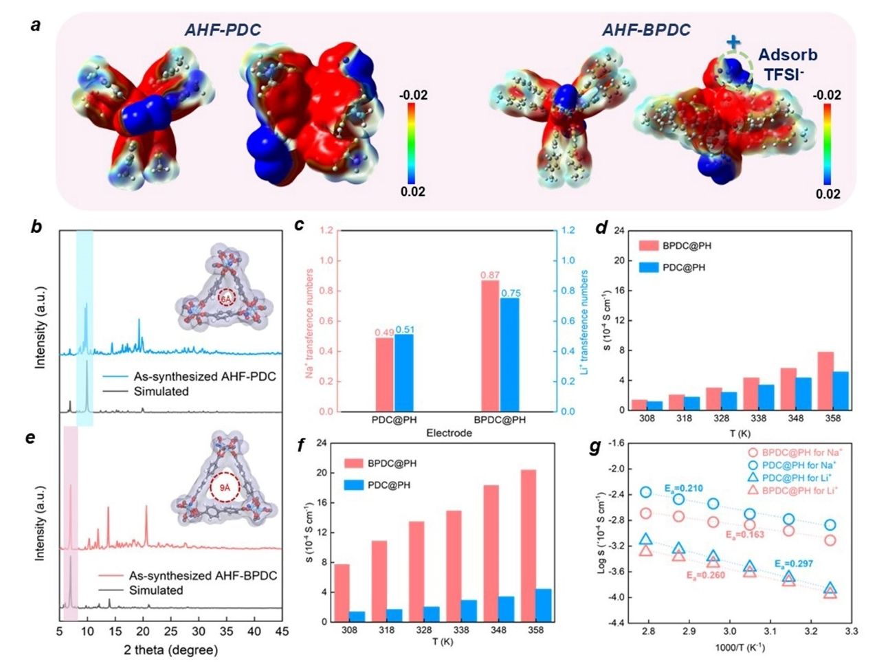 針對上述問題,近日,陜西科技大學化學與化工學院黃文歡教授團隊設計出兩種鋅基MOF材料(AHF-PDC與AHF-BPDC),通過調(diào)控配體長度形成孔徑分別為6 ?和9 ?的一維通道。其中,BPDC@PH電解質(zhì)憑借更大的孔道(9 ?)及孔壁靜電吸附特性,顯著優(yōu)化了鈉離子(Na?)的擴散路徑。同時,該材料能夠選擇性吸附陰離子(TFSI?),從而將離子遷移數(shù)提升至0.87,并在35°C下實現(xiàn)了7.74 × 10?? S cm?1的高電導率。這一研究為開發(fā)高性能鈉金屬電池電解質(zhì)提供了重要的理論依據(jù)和實驗支持。相關工作在《Advanced Functional Materials》期刊上以“Enhanced Ionic Diffusion via Refined Pillared 1D Channels for Sodium Metal Batteries”為題發(fā)表。