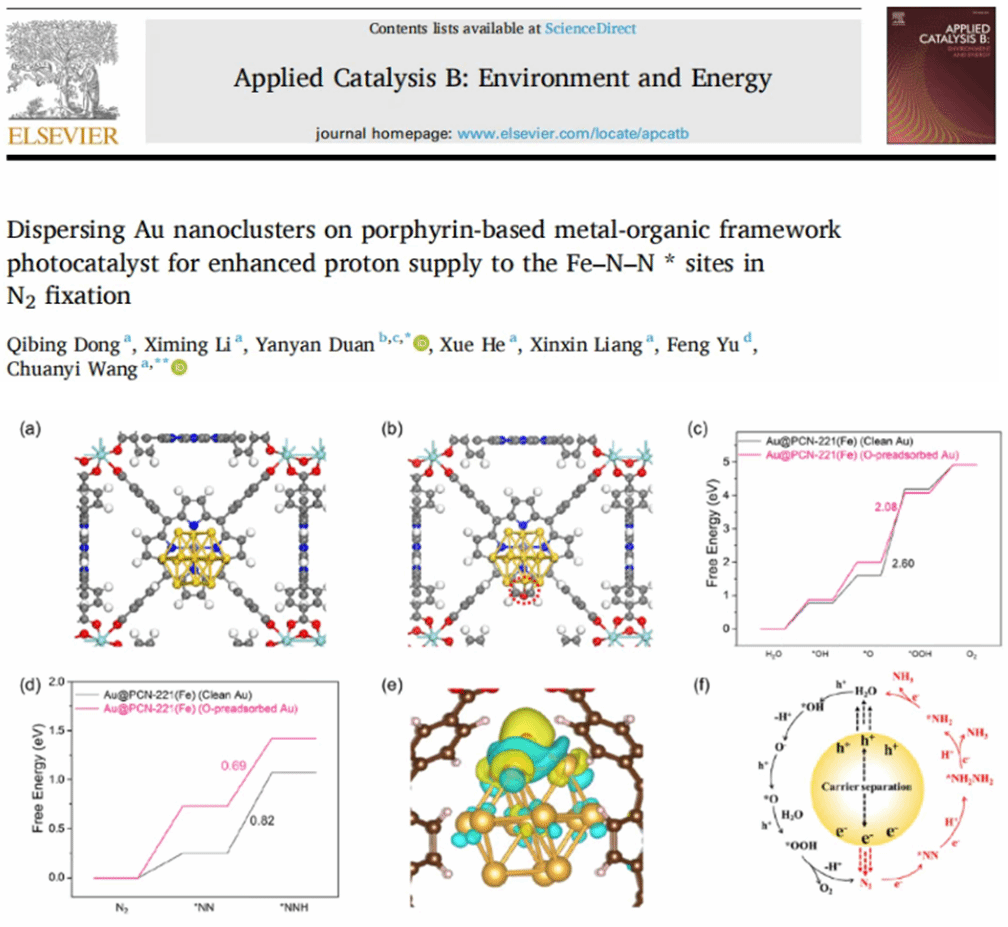 相關成果以“Dispersing Au nanoclusters on porphyrin-based metal-organic framework photocatalyst for enhanced proton supply to the Fe–N–N*?sites in N2 fixation”為題,發(fā)表在Applied Catalysis B: Environment and Energy(IF = 20.2)上。陜西科技大學為論文第一通訊單位,環(huán)境學院2021級博士研究生董奇兵為該論文的第一作者,環(huán)境學院王傳義教授為論文通訊作者。