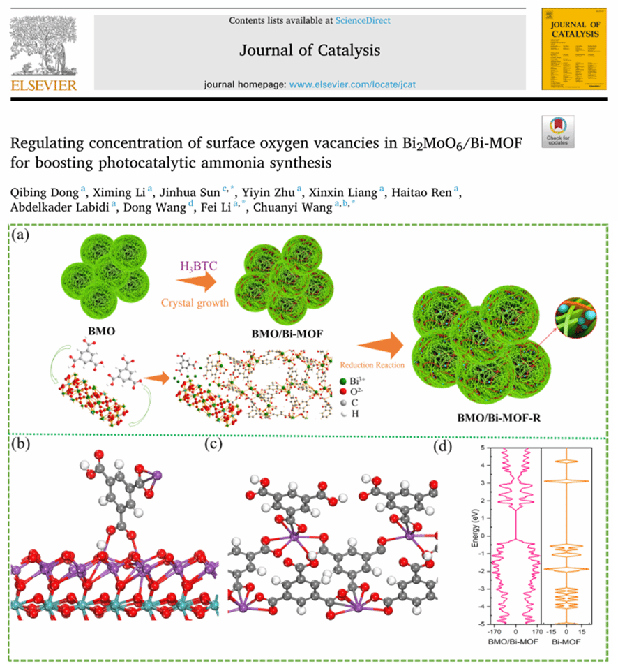 系列成果四:表面氧空位(OVs)工程作為提升光催化性能的有效策略已被廣泛采用。然而,目前能夠精準調(diào)控表面OVs濃度并闡明其對固氮活性影響機制的光催化體系仍較為匱乏。本研究以Bi2MoO6(BMO)為基底,通過在其表面負載鉍基金屬有機框架(Bi-MOF)構建可操作平臺,利用Bi-MOF組分中鉍離子的還原特性實現(xiàn)OVs濃度的精準調(diào)控。