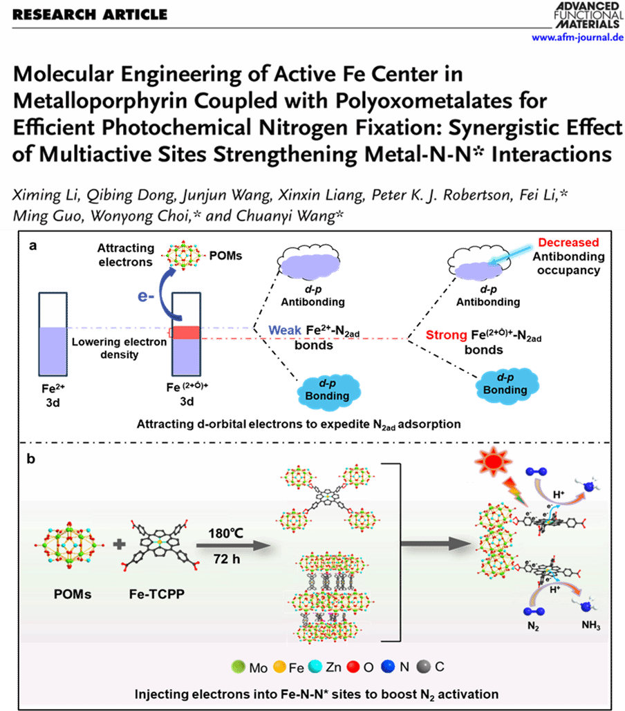 相關成果以“Molecular engineering of active Fe center in metalloporphyrin coupled with polyoxometalates for efficient photochemical nitrogen fixation: Synergistic effect of multiactive sites strengthening metal-N-N* interactions”為題,發(fā)表在Advanced Functional Materials(IF = 18.5)上。陜西科技大學為論文第一通訊單位,環(huán)境學院2021級博士研究生李喜明為該論文的第一作者,環(huán)境學院王傳義教授為論文通訊作者。