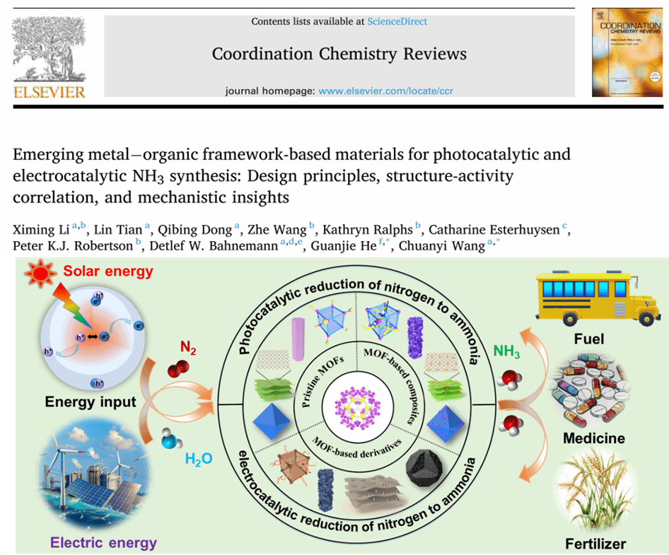相關成果以“Emerging metal?organic framework-based materials for photocatalytic and electrocatalytic NH3 synthesis: Design principles, structure-activity correlation, and mechanistic insights”為題,發(fā)表在Coordination Chemistry Reviews(IF = 20.3)上。陜西科技大學為論文第一通訊單位,論文第一作者為環(huán)境學院2021級博士研究生李喜明,環(huán)境學院王傳義教授為論文通訊作者。