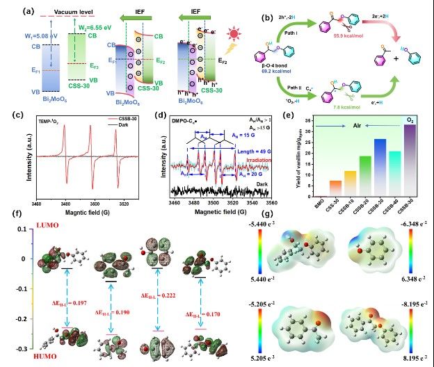 如圖所示,S型異質(zhì)結(jié)的構(gòu)建可以保持高氧化還原電位并改善電荷分離,從而實現(xiàn)高效光催化反應。在Cβ-O鍵的裂解過程中,S型的電荷流動方式促進了1O2的生成,誘導Cα?自由基的生成。在此過程中Cβ-O鍵的解離能從69.2 kcal/mol大幅衰減到7.8kcal/mol,這一過程促進了Cβ-O的劈裂,從而促進高值化轉(zhuǎn)化。此外,為了驗證CSSB-30光催化劑對實際木質(zhì)素中Cβ-O帶的裂解能力,以馬尾松堿木質(zhì)素為底物,堿木質(zhì)素Cβ-O裂解的典型產(chǎn)物為香蘭素,獲得了26.6 mg/木質(zhì)素的香蘭素高產(chǎn)率,證明了堿木質(zhì)素中Cβ-O鍵的有效裂解。