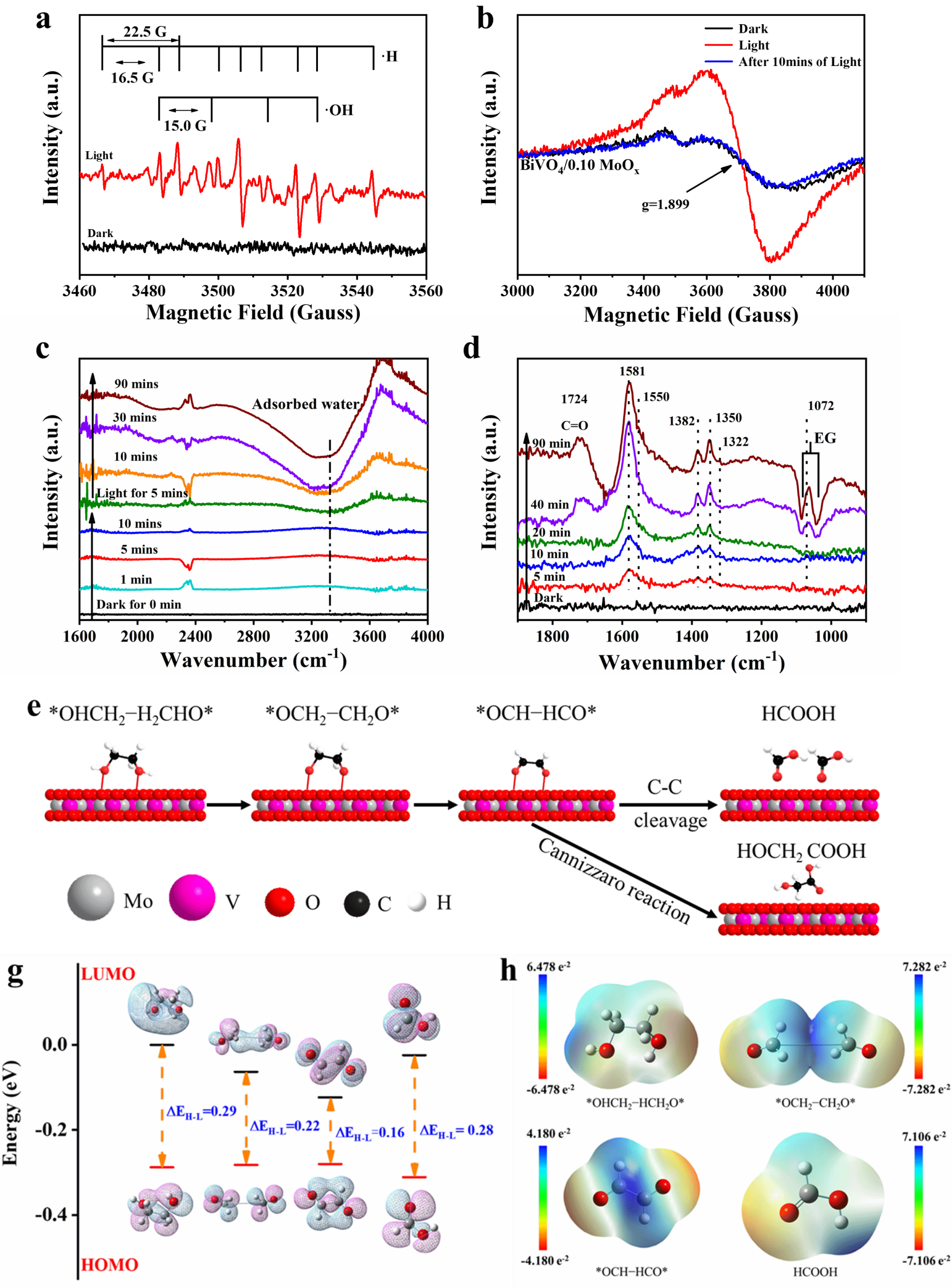 在PET的光重整過程中,MoOx的引入會誘導BiVO4的光生電子向其遷移,在此過程中Mo6+將被還原為Mo5+,這一過程促進了H自由基的生成,從而促進產(chǎn)氫。此外,EG在反應過程中逐步地被轉(zhuǎn)化為乙二醛及乙二酸,最終形成甲酸并穩(wěn)定存在。