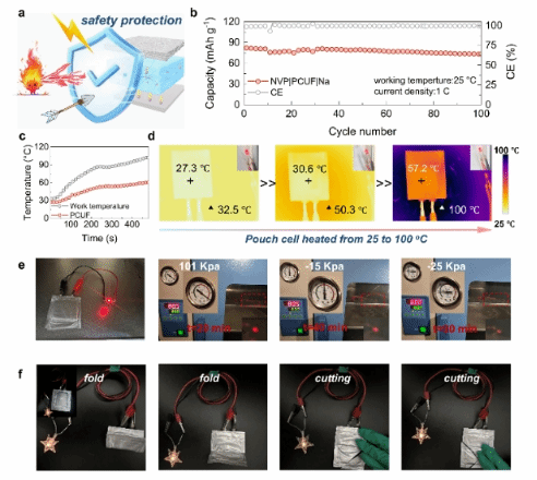 圖4:基于PCUF電解質(zhì)準(zhǔn)固態(tài)鈉金屬軟包電池性能及安全性能測(cè)試