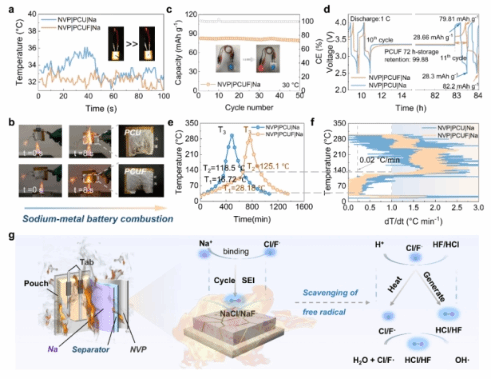 圖5:基于PCUF電解質(zhì)準(zhǔn)固態(tài)鈉金屬軟包電池高溫性能,ARC測(cè)試及電池阻燃機(jī)理