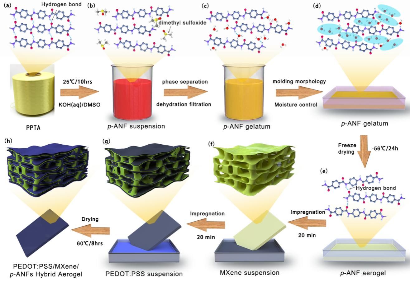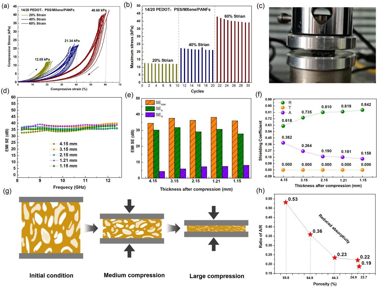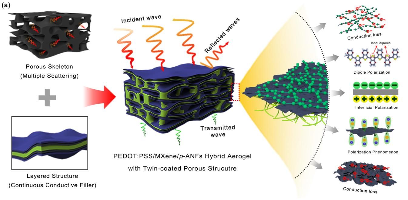 針對傳統(tǒng)電磁屏蔽材料反射效能高、效能不可諧調(diào)的瓶頸問題,提出“微孔骨架-梯度導電層”耦合策略,通過冷凍干燥與靜電自組裝實現(xiàn)p-ANFs、MXene與PEDOT:PSS的有序集成,創(chuàng)新性構(gòu)建兼具微米孔與納米導電網(wǎng)絡的雙涂層氣凝膠。p-ANF形成的微孔骨架通過多重反射延長電磁波傳播路徑,增強吸收損耗;MXene層提供高導電網(wǎng)絡,PEDOT:PSS外層調(diào)控表面阻抗降低反射,突破吸收/反射性能的強關聯(lián)性矛盾,同時揭示微孔結(jié)構(gòu)形變誘導導電網(wǎng)絡重構(gòu)調(diào)控電磁損耗的規(guī)律,實現(xiàn)屏蔽效能41.27 dB,反射效能3.66 dB(達綠色屏蔽標準),絕對屏蔽效能達3063.7 dB·cm2·g?1。該研究成果可應用于5G通信、可穿戴設備、航空航天等領域,為解決電磁污染、提升精密設備穩(wěn)定性提供解決方案。