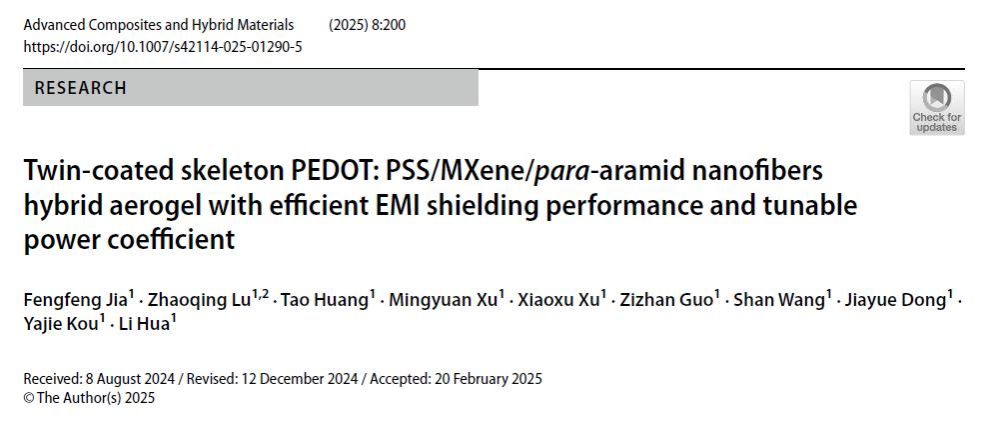 研究團隊提出“雙涂層骨架”設計策略,通過對位芳綸納米纖維(p-ANF)構(gòu)建多孔骨架,依次浸漬MXene薄片與PEDOT:PSS導電鏈,形成分層多孔結(jié)構(gòu)。該多孔結(jié)構(gòu)壓縮形變可調(diào)控孔隙率,進而實現(xiàn)“反射-吸收”機制的靈活切換,為低反射和可諧調(diào)設計提供了新思路。相關工作以“Twin-coated Skeleton PEDOT: PSS/MXene/para-aramid Nanofibers Hybrid Aerogel with Efficient EMI Shielding Performance and Tunable Power Coefficient”為題發(fā)表在國際期刊《Advanced Composites and Hybrid Materials》(IF=23.2)。論文第一作者為師資博士后賈峰峰,通訊作者為陜西科技大學陸趙情、花莉教授。