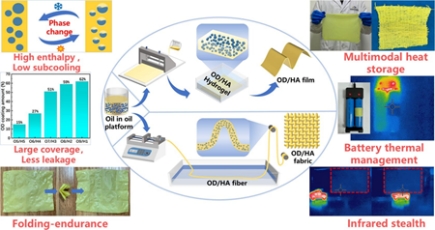 團(tuán)隊(duì)將苯并咪唑二胺引入到芳香族聚酰胺中,通過自下而上法得到了高溶解度、良好加工性能的雜環(huán)芳綸溶液,并采用流延法制備了雜環(huán)芳綸薄膜。該薄膜的拉伸強(qiáng)度、儲能模量和擊穿強(qiáng)度分別達(dá)到162 MPa、8 GPa、90.14 kV/mm,有望用于高性能絕緣材料。同時,將雜環(huán)芳綸溶液引入油包油乳液模板中,利用雜環(huán)芳綸包覆相變材料十八烷,進(jìn)一步通過涂布法和濕法紡絲制備了雜環(huán)芳綸/十八烷復(fù)合相變薄膜和相變纖維,在溫度調(diào)節(jié)、紅外隱身及熱管理等領(lǐng)域具有廣闊應(yīng)用前景。研究工作拓寬了芳綸復(fù)合材料的加工成型方法,為芳綸基功能材料構(gòu)筑提供了新思路。相關(guān)內(nèi)容發(fā)表在《Materials Letters》和《Chemical Engineering Journal》上,主要工作由碩士研究生許文龍完成,譚蕉君副教授為通訊作者。