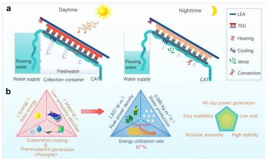 研究團(tuán)隊(duì)創(chuàng)新性地集成了大面積低發(fā)射率太陽(yáng)能吸收器、溫差發(fā)電片與被動(dòng)式界面蒸發(fā)器,成功構(gòu)建出可全天候連續(xù)運(yùn)行的水—電聯(lián)產(chǎn)系統(tǒng)。該系統(tǒng)通過耦合增強(qiáng)的太陽(yáng)能光熱轉(zhuǎn)換與蒸發(fā)冷卻效應(yīng),在顯著提升熱電輸出功率的同時(shí),實(shí)現(xiàn)了淡水的持續(xù)高效收集。尤為關(guān)鍵的是,夜間持續(xù)的蒸發(fā)冷卻效應(yīng)使得系統(tǒng)冷端溫度始終低于環(huán)境熱端溫度,從而維持了驅(qū)動(dòng)系統(tǒng)晝夜連續(xù)運(yùn)行的穩(wěn)定溫差。