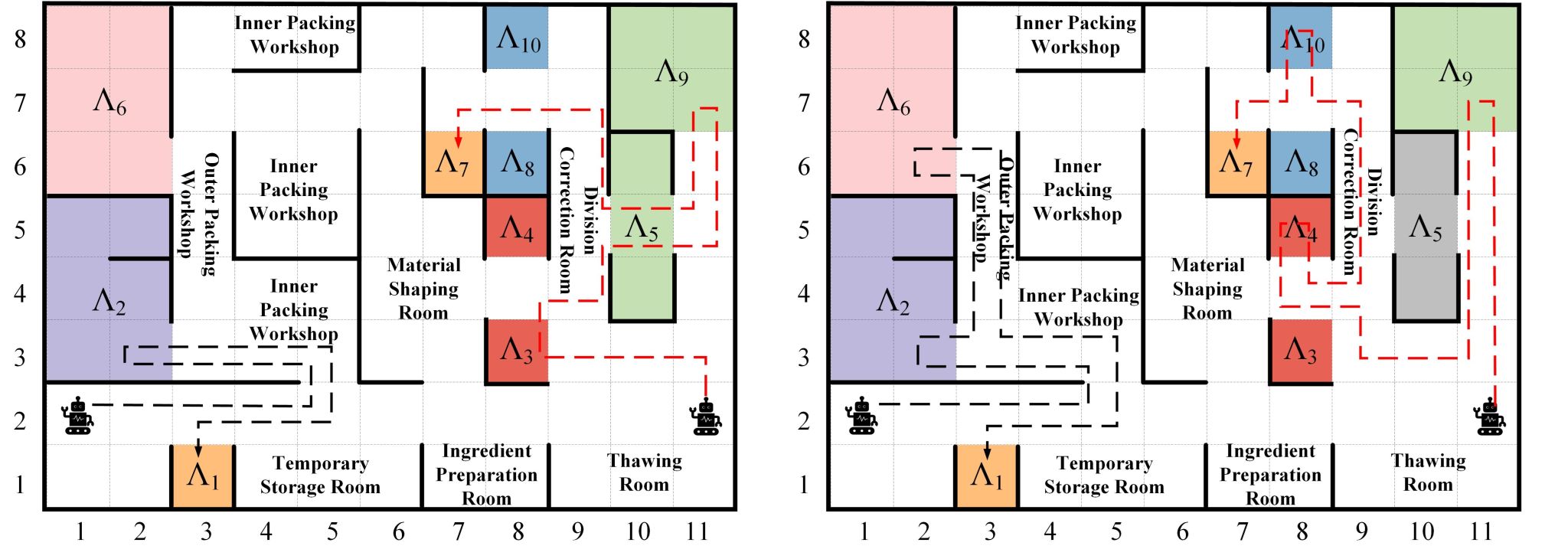 針對(duì)上述難點(diǎn),本研究團(tuán)隊(duì)提出了一種基于Petri網(wǎng)的多機(jī)器人系統(tǒng)最優(yōu)路徑規(guī)劃方法。通過(guò)將多機(jī)器人系統(tǒng)抽象為圖形化的Petri網(wǎng)模型,并設(shè)計(jì)結(jié)構(gòu)控制器,實(shí)現(xiàn)復(fù)雜任務(wù)約束的形式化表征。為避免機(jī)器人數(shù)量增加而引發(fā)狀態(tài)爆炸問(wèn)題,提出一種狀態(tài)空間壓縮方法和高效的實(shí)時(shí)在線規(guī)劃算法,實(shí)現(xiàn)多機(jī)器人復(fù)雜任務(wù)的實(shí)時(shí)分配和最優(yōu)路徑規(guī)劃。理論分析與數(shù)值實(shí)驗(yàn)均表明,該方法在保證規(guī)劃最優(yōu)性的同時(shí),顯著提升了計(jì)算效率和可擴(kuò)展性,尤其在機(jī)器人數(shù)量和環(huán)境規(guī)模不斷增加的情況下,表現(xiàn)出優(yōu)于現(xiàn)有方法的性能。