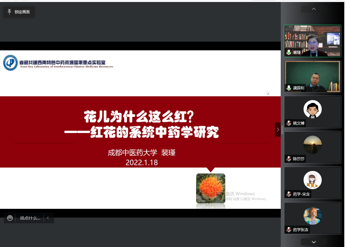 裴瑾以“紅花的系統(tǒng)中藥學(xué)研究”為題進(jìn)行學(xué)術(shù)報(bào)告,首先圍繞川藥紅花進(jìn)行了系統(tǒng)性的質(zhì)量及藥用品種研究評(píng)價(jià):紅花臨床應(yīng)用范圍廣泛,食用和藥用價(jià)值巨大,作為“君藥”,對(duì)包括新冠在內(nèi)的多種疾病都具有明顯的治療效果。裴以“辯色論質(zhì)理念”對(duì)紅花藥材進(jìn)行質(zhì)量評(píng)價(jià),并進(jìn)一步從評(píng)價(jià)-藥效關(guān)系角度研究了紅花的活血化瘀功效,同時(shí)基于ISO國(guó)際標(biāo)準(zhǔn)為中藥走向國(guó)際做了大量的鋪墊工作。接著以“桃紅四物湯”為例,對(duì)紅花的主要成分進(jìn)行了生物學(xué)活性研究,在炮制的古今差異性研究中做到“尊古,宜今”,對(duì)不同工藝的炮制進(jìn)行了化學(xué)成分以及藥效的差異分析,并探究藥理學(xué)機(jī)制。最后,她為廣大師生詳細(xì)的介紹了紅花的發(fā)展歷史、研究現(xiàn)狀、前沿動(dòng)態(tài),對(duì)基于經(jīng)典名方的中藥現(xiàn)代化分享了寶貴的經(jīng)驗(yàn)。同時(shí),還結(jié)合陜西秦巴山區(qū)豐富的中醫(yī)藥資源,為我校藥學(xué)專(zhuān)業(yè)學(xué)科結(jié)合當(dāng)?shù)靥厣_(kāi)展研究和教育提出了寶貴的建議,為我校新藥研發(fā)及藥理活性研究提供了重要的借鑒和指導(dǎo)意義。