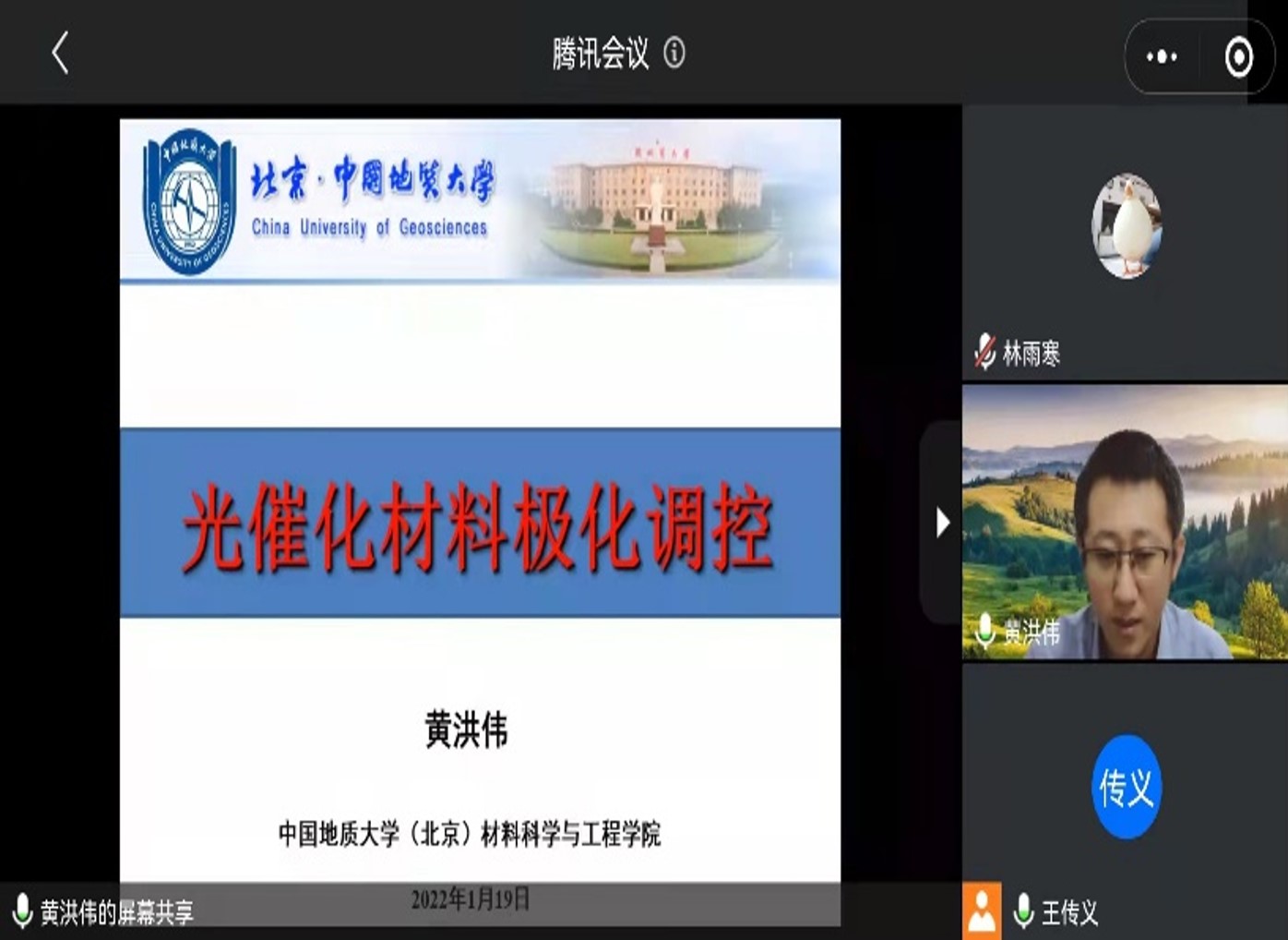 黃洪偉的報告題目為“光催化材料極化調控”,他指出光催化材料中光生電荷在體相和表面的復合仍然極具挑戰(zhàn),并結合自身科研團隊研究成果詳細介紹了利用晶體自發(fā)極化、鐵電極化、壓電極化調控等方式促進體相光生電荷有效分離以及利用表面結構調控促進表面電荷高效分離的手段。