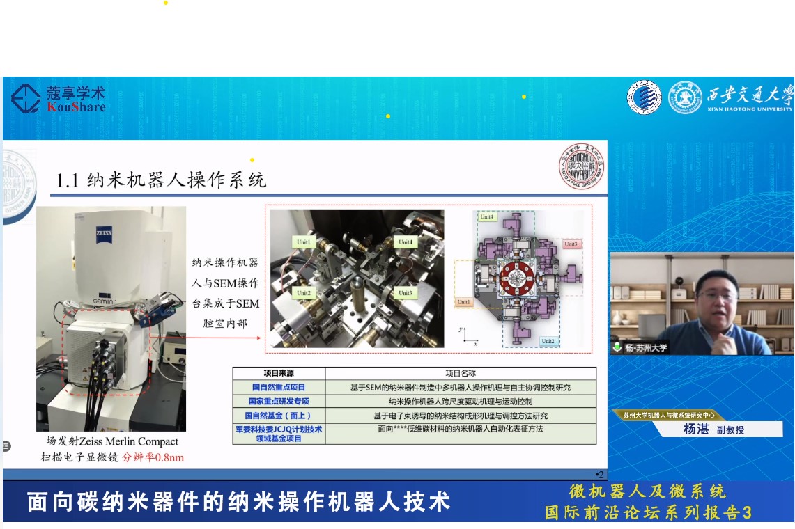 1月19日,應機電工程學院及研究生院邀請,蘇州大學機器人與微系統(tǒng)研究中心楊湛副教授,做客我校與西安交通大學聯(lián)合舉辦的“微機器人及微系統(tǒng)國際前沿論壇系列報告3”,作了題為“面向碳納米器件的納米操作機器人技術”的學術報告。報告會采用線上與線下相結(jié)合的方式,通過“蔻享學術”平臺進行了在線直播。報告會由機電工程學院常博教授主持,校內(nèi)外300多位學者及研究生聆聽了此次精彩報告。