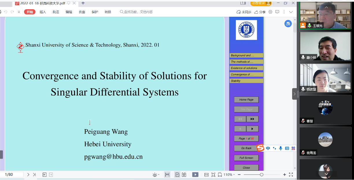1月18日上午,應(yīng)數(shù)學(xué)與數(shù)據(jù)科學(xué)學(xué)院邀請,河北大學(xué)副校長、教育部大學(xué)數(shù)學(xué)課程教指委委員王培光做客我?!扒把乜茖W(xué)報(bào)告”,作了題為“Convergence for Singular Differential Systems with Maxima”的學(xué)術(shù)報(bào)告。副校長李學(xué)軍出席報(bào)告會(huì),并在報(bào)告會(huì)之前線上與王培光副校長進(jìn)行了交流。報(bào)告由數(shù)學(xué)學(xué)院院長藺小林主持,數(shù)學(xué)學(xué)院領(lǐng)導(dǎo)、全體教師和研究生參加了本次報(bào)告。