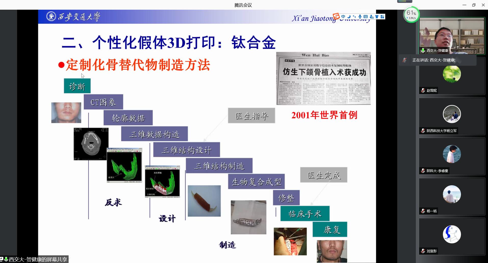 賀健康從3D打印的醫(yī)學應用、個性化假體3D打印、可降解支架3D打印、微納生物3D打印四個方面,講解了國內(nèi)外生物3D打印領域的研究前沿和發(fā)展動態(tài)。對相關研究方向在申請國家自然科學基金時如何緊跟國內(nèi)外生物3D打印領域前沿、獨辟蹊徑、深挖科學問題提供了建設性的思路。通過他們團隊科研成果落地醫(yī)院臨床應用的大量實例,講述了科學家、醫(yī)生、工程師如何成功合作,服務人類健康,挽救患者生命及提高人民生活質(zhì)量,貢獻生物3D打印科研人員的力量。對我校生物3D打印研究服務陜西地方經(jīng)濟,加快裝備與產(chǎn)品產(chǎn)業(yè)化應用帶來了寶貴經(jīng)驗。最后,賀健康在3D打印與臨床醫(yī)學結(jié)合、假體制造、支架與活性器官制造宏微結(jié)構(gòu)一體化、3D打印技術等醫(yī)工交叉領域如何創(chuàng)新性地開展科研給出了可操作性的建議。報告不僅對學院生物3D打印領域技術研究具有重要的借鑒和指導意義,同時對學院仿生制造技術與理論學科方向發(fā)展及博士點建設具有重要的促進作用。