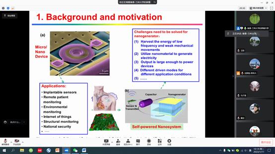 秦勇教授主要介紹了壓電納米發(fā)電機(jī)的設(shè)計(jì)及性能優(yōu)化,和摩擦納米發(fā)電機(jī)方面最新的研究成果。報(bào)告現(xiàn)場(chǎng)氣氛熱烈,參會(huì)師生就感興趣的方面,與秦勇教授進(jìn)行了熱切的交流。交流過程中,雙方都迸發(fā)出許多新的想法和火花,參會(huì)師生表示受益匪淺。
