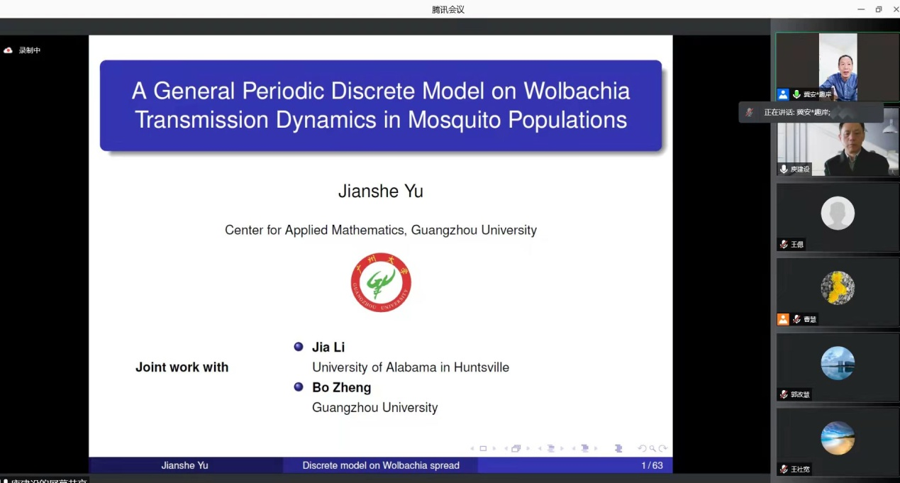 1月12日下午,應(yīng)數(shù)學(xué)與數(shù)據(jù)科學(xué)學(xué)院的邀請,廣州大學(xué)庾建設(shè)教授做客我?!扒把乜茖W(xué)報告”,并作了題為“沃爾巴克在蚊子種群中傳播的周期離散模型研究”報告。報告由數(shù)學(xué)學(xué)院生物數(shù)學(xué)團隊負責人李建全教授主持,數(shù)學(xué)學(xué)院和文理學(xué)院部分領(lǐng)導(dǎo)、數(shù)學(xué)學(xué)院教師和全體研究生參加了本次報告。