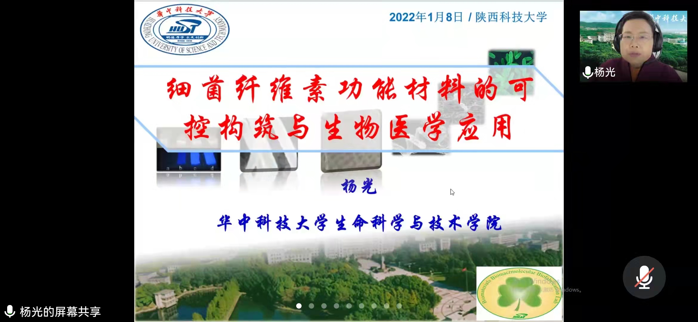 1月8日,應(yīng)我校輕工科學(xué)與工程學(xué)院、科技處及前沿院邀請,華中科技大學(xué)楊光教授做客我校“前沿科學(xué)報告”,作了題為“細(xì)菌纖維素功能材料的可控構(gòu)筑與生物醫(yī)學(xué)”的線上學(xué)術(shù)報告。報告由輕工學(xué)院副院長劉國棟主持,學(xué)院部分教師、相關(guān)專業(yè)研究生及本科生聆聽了本次報告。