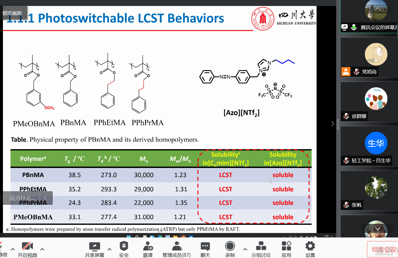王彩虹副教授首先介紹了離子液體及其在光、熱響應智能材料方面應用的研究背景,然后結(jié)合聚合物微觀結(jié)構(gòu)響應自組裝調(diào)控體系宏觀相變、傳導率變化,重點介紹了刺激響應聚合物自組裝調(diào)控離子液體相變及性能。王彩虹副教授的報告邏輯清晰、圖文并茂,引發(fā)了大家對刺激響應聚合物新的認識與思考。