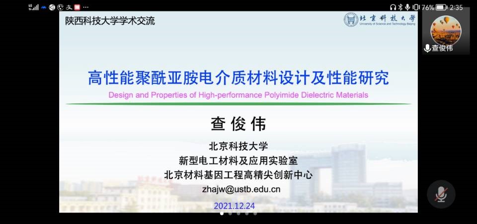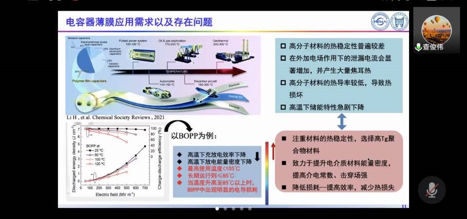 12月24日下午,應(yīng)材料科學(xué)與工程學(xué)院邀請(qǐng),北京交通大學(xué)查俊偉教授做客我校“前沿科學(xué)報(bào)告”論壇,作了題為“高性能聚酰亞胺電介質(zhì)材料設(shè)計(jì)及性能研究”的學(xué)術(shù)報(bào)告。本次報(bào)告由材料學(xué)院王卓副院長主持,學(xué)院相關(guān)教師和學(xué)生參加了本次報(bào)告會(huì),因疫情影響,本次報(bào)告采取線上的方式進(jìn)行。