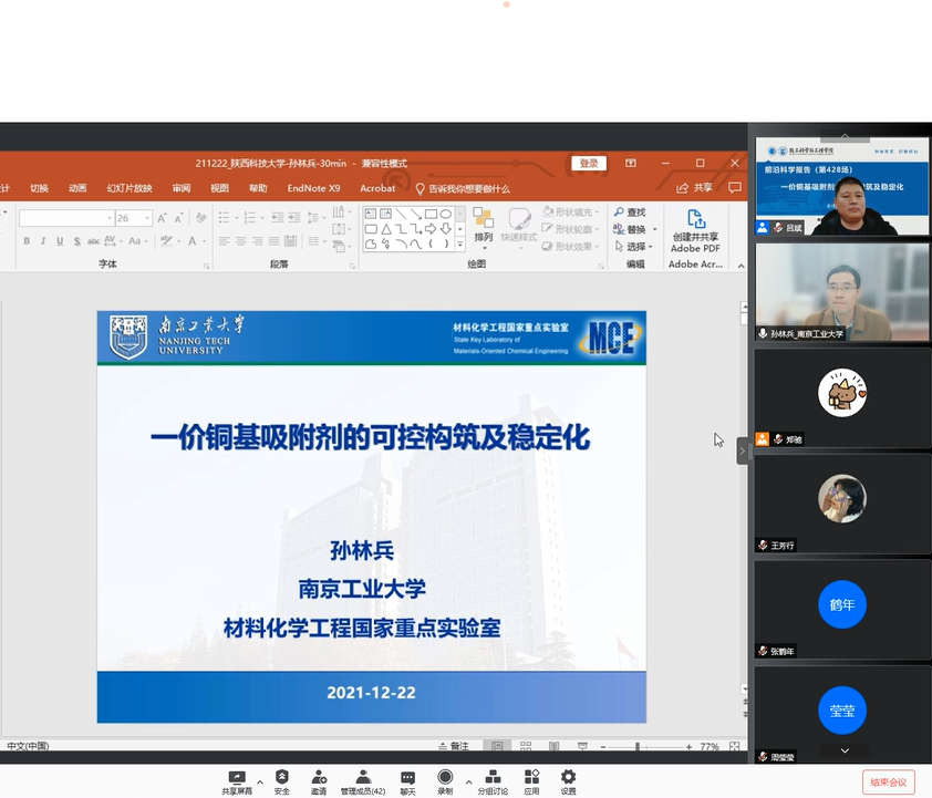 孫林兵教授提出將一價銅基吸附劑應用于化工產(chǎn)品分離,以解決在分離過程中能耗高的難題,重點介紹了一價銅基吸附劑活性位的價態(tài)調(diào)控及穩(wěn)定化等方面的系列研究成果。最后,孫林兵教授與在場師生對相關問題進行了探討和解答,線上氣氛熱烈。此次報告開拓了學院師生在吸附領域的視野,對相關師生的研究具有一定的啟發(fā)。