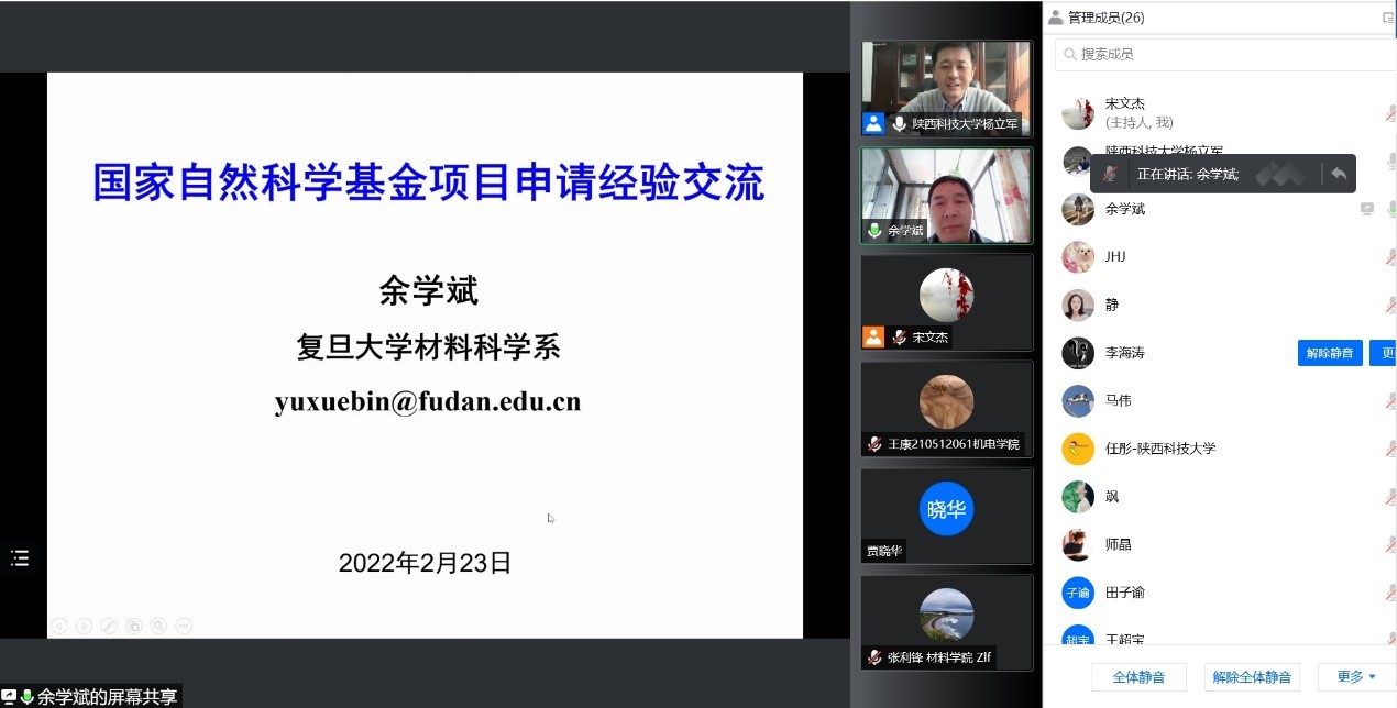 2月23日,應(yīng)科技處、前沿院和機電學院邀請,國家杰出青年基金獲得者、科技部科技創(chuàng)新領(lǐng)軍人才、中組部“萬人計劃”科技創(chuàng)新領(lǐng)軍人才、國家自然科學基金會評專家、博士生導師、復旦大學材料科學系余學斌教授,作了題為“國家自然科學基金項目申請經(jīng)驗交流”的前沿科學報告。報告采用線上形式舉行,由機電學院副院長楊立軍主持,機電學院、材料學院60余位教師參會。