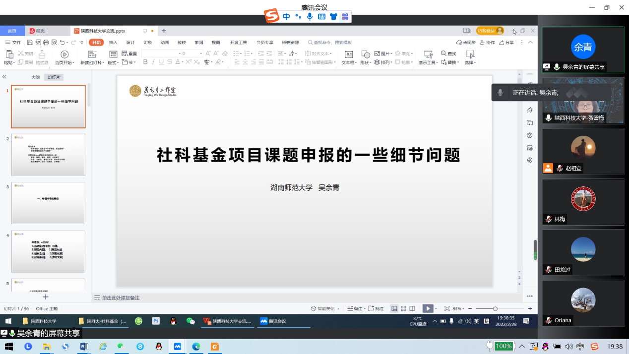 2月28日晚,應(yīng)設(shè)計(jì)與藝術(shù)學(xué)院與科技處邀請,湖南師范大學(xué)吳余青教授云端做客我?!扒把乜茖W(xué)報(bào)告”,作了題為“國家社科基金項(xiàng)目申報(bào)論證輔導(dǎo)”的學(xué)術(shù)報(bào)告。報(bào)告會由設(shè)藝學(xué)院副院長賀雪梅教授主持,學(xué)院部分教師聆聽了此次精彩分享。