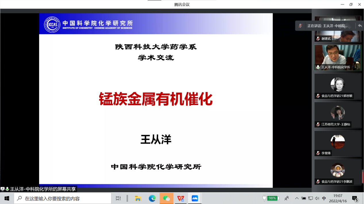 4月16日,應(yīng)食品與生物工程學(xué)院邀請,中國科學(xué)院王從洋研究員、杜海峰研究員以及江蘇師范大學(xué)石楓教授做客我校前沿科學(xué)報(bào)告,分別作了題為“錳族金屬有機(jī)催化”“Asymmetric Catalysis with FLPs”“手性吲哚化學(xué)”的學(xué)術(shù)報(bào)告。食品學(xué)院部分教師和研究生參加了本次報(bào)告,報(bào)告會(huì)由食品學(xué)院副院長李國梁(主持工作)主持。