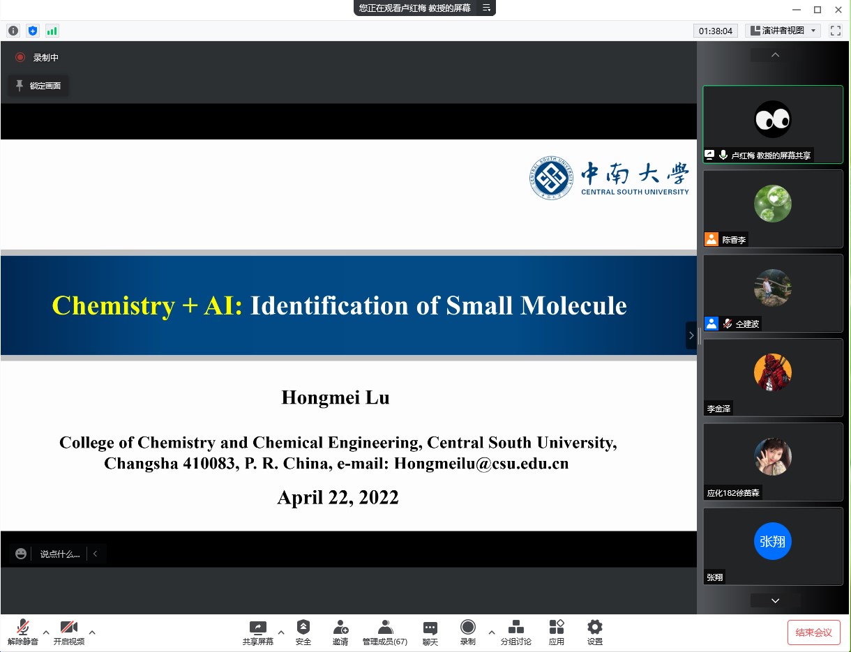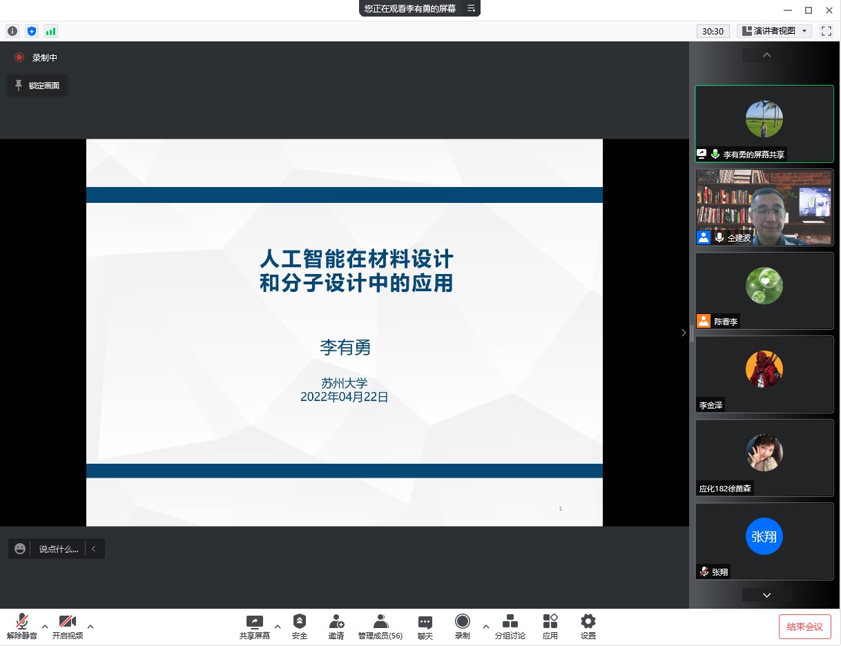 4月22日,應(yīng)我??萍继?、前沿院及化學(xué)與化工學(xué)院邀請,蘇州大學(xué)李有勇教授和中南大學(xué)盧紅梅教授做客我?!扒把乜茖W(xué)報(bào)告”,作了題為“人工智能在材料設(shè)計(jì)和分子設(shè)計(jì)中的應(yīng)用”和“Chemistry + AI: Identification of Small Molecule”的報(bào)告。報(bào)告會由化工學(xué)院副院長仝建波主持,學(xué)院相關(guān)專業(yè)教師、研究生聆聽了此次報(bào)告會。