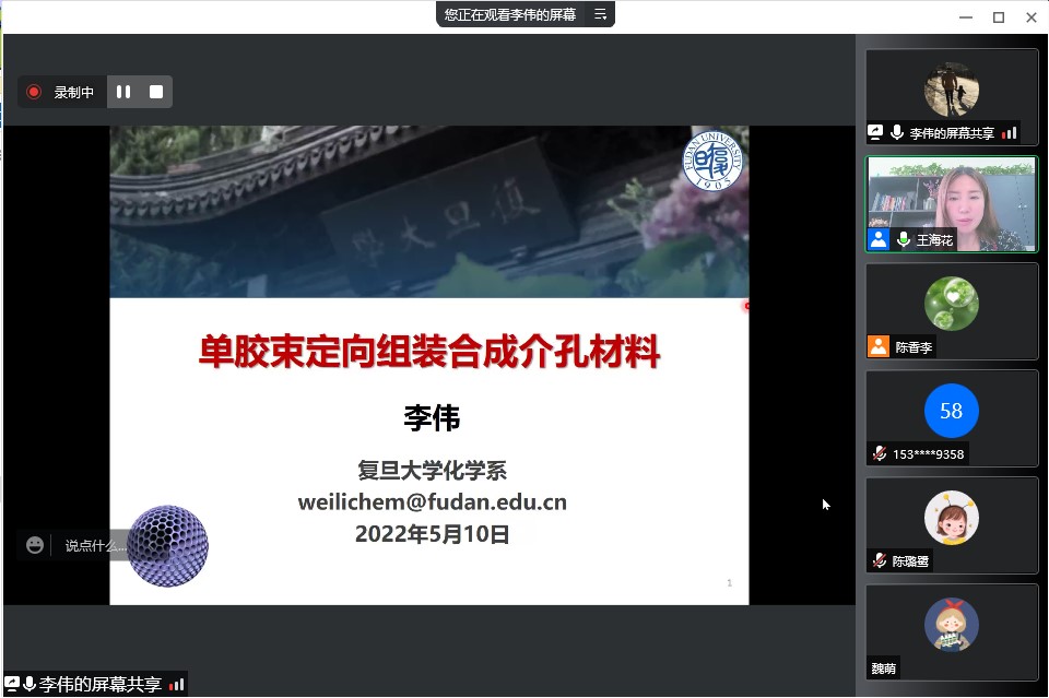 李偉教授從介孔材料在能源、健康、信息、環(huán)境、安全等領(lǐng)域應(yīng)用的背景出發(fā),介紹了單膠束定向合成介孔材料的相關(guān)研究:精準(zhǔn)構(gòu)筑了系列核殼結(jié)構(gòu)功能復(fù)合介孔材料;通過調(diào)控表面電負(fù)性,疏水作用調(diào)控表面活性劑組裝,實(shí)現(xiàn)單膠束基元可控組裝;發(fā)展了聚合物輔助的轉(zhuǎn)移方法,構(gòu)筑了自支撐介孔氧化硅分離膜,實(shí)現(xiàn)了膠體納米晶的分離和提純;調(diào)控疏水相大小和膠束數(shù)量,實(shí)現(xiàn)孔道結(jié)構(gòu)和孔道大小的定向構(gòu)筑;程序化調(diào)控單膠束基元定向組裝實(shí)現(xiàn)了多級結(jié)構(gòu)介孔碳納米球結(jié)構(gòu)調(diào)控;疏水/親水嵌段比調(diào)控單膠束基元的結(jié)構(gòu)實(shí)現(xiàn)介觀相的調(diào)控。