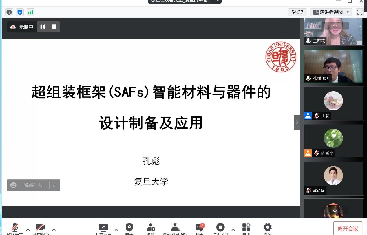 孔彪教授針對超組裝框架(SAFs)材料設(shè)計合成,SAFs智能納米通道在分子感知中的應(yīng)用,SAFs智能微納米界面在生物診療中的應(yīng)用以及SAFs在一體化可穿戴器件中的應(yīng)用四個方面展開詳細介紹,構(gòu)建了多種超組裝的智能材料與器件。