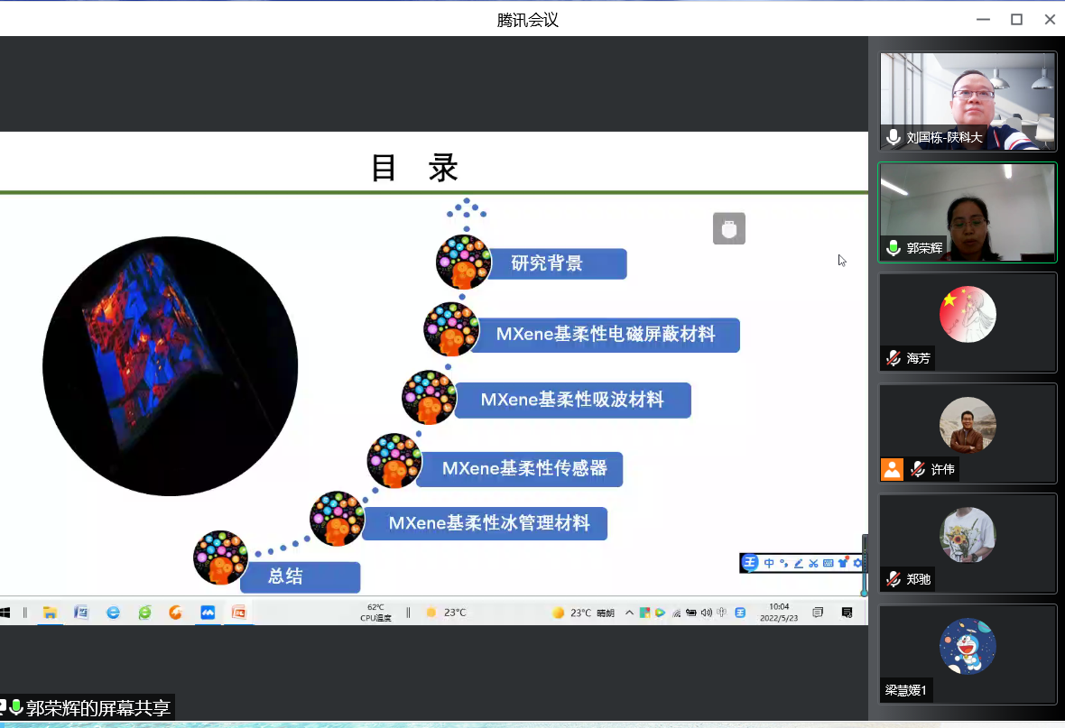 5月23日上午,應(yīng)我校輕工科學(xué)與工程學(xué)院、科技處及前沿院邀請(qǐng),四川大學(xué)郭榮輝教授做客我?!扒把乜茖W(xué)報(bào)告”,作了題為“MXene基柔性功能材料”的線(xiàn)上報(bào)告。報(bào)告會(huì)由輕工學(xué)院副院長(zhǎng)劉國(guó)棟主持,學(xué)院相關(guān)專(zhuān)業(yè)教師、研究生參加了此次報(bào)告會(huì)。