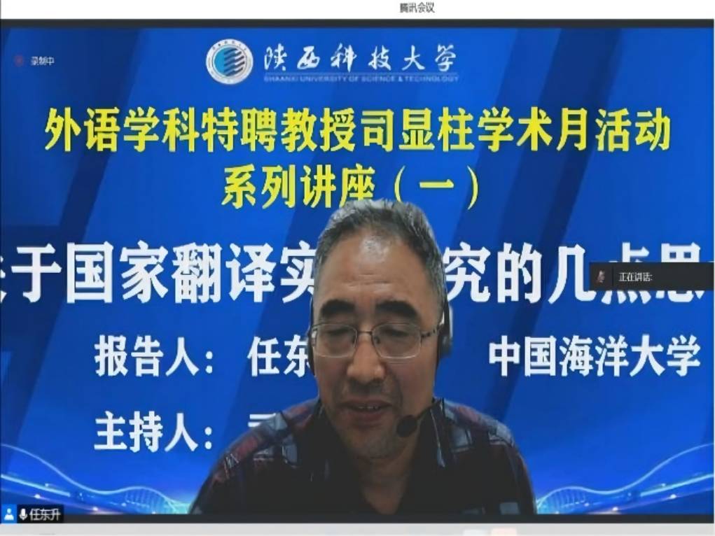 6月9日晚,中國海洋大學(xué)任東升教授應(yīng)邀做客我校“前沿學(xué)科報告”,作為我校文理學(xué)院外語學(xué)科特聘教授司顯柱學(xué)術(shù)月活動系列講座首位開講嘉賓,做了題為“關(guān)于國家翻譯實踐研究的幾點思考”的線上報告。報告由司顯柱教授主持,文理學(xué)院師生150余人聆聽了此次報告。文理學(xué)院6月組織開展的外語學(xué)科特聘教授司顯柱學(xué)術(shù)活動系列講座,旨在充分發(fā)揮我校特聘教授學(xué)術(shù)引領(lǐng)和資源共享作用,推動我校外語學(xué)科內(nèi)涵發(fā)展。