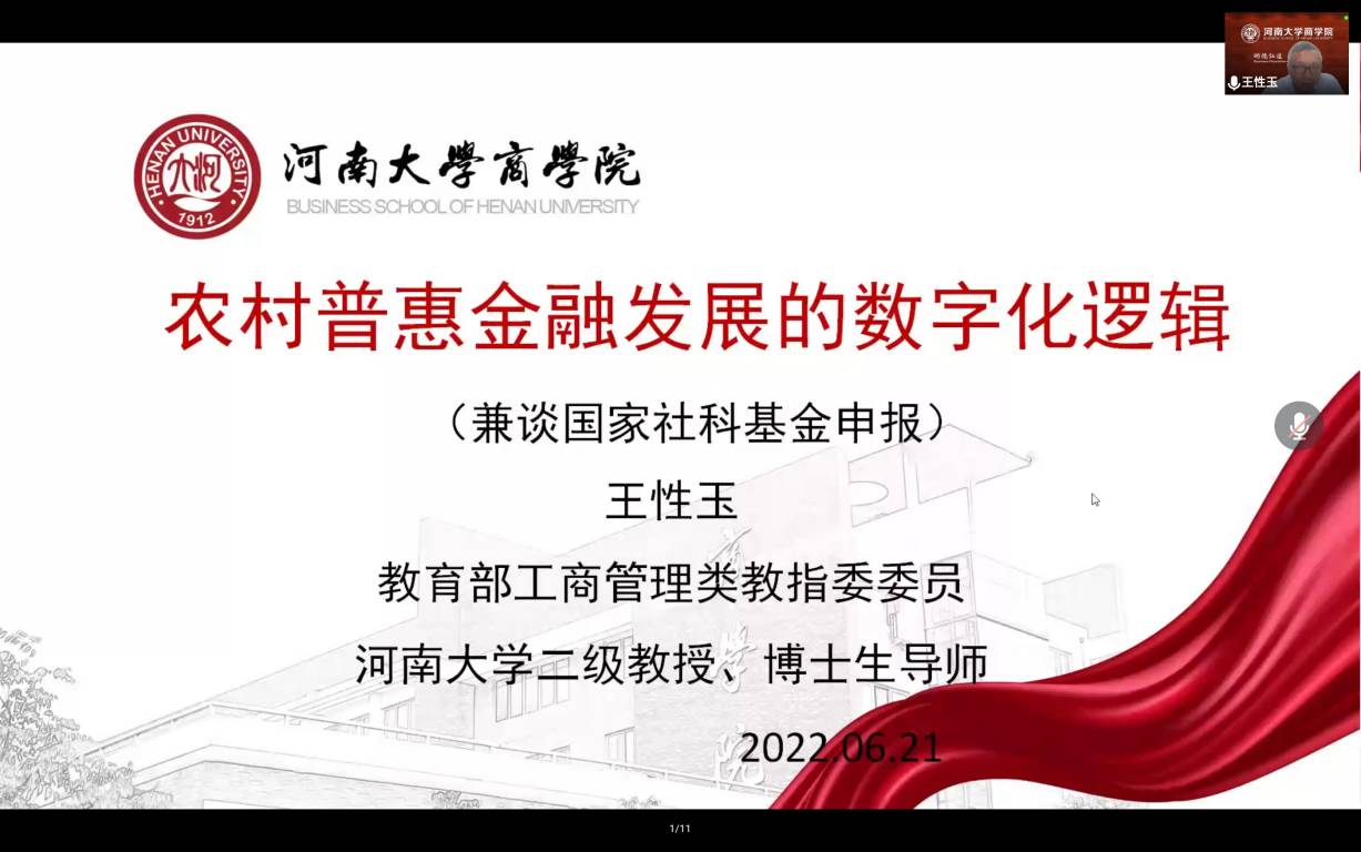 6月21日,應(yīng)我??萍继?、經(jīng)濟(jì)與管理學(xué)院邀請(qǐng),河南大學(xué)商學(xué)院院長(zhǎng)王性玉教授做客我?!扒把乜茖W(xué)報(bào)告”,為我校師生帶來(lái)主題為“農(nóng)村普惠金融發(fā)展的數(shù)字化邏輯--兼談國(guó)家社科基金申報(bào)”的線上報(bào)告。報(bào)告由經(jīng)管學(xué)院副院長(zhǎng)薛儉主持,經(jīng)管學(xué)院教師、研究生代表聆聽(tīng)了此次報(bào)告。