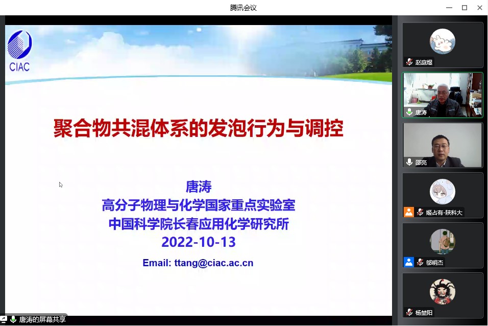 10月13日,受我??萍继?、化學(xué)與化工學(xué)院邀請(qǐng),中國科學(xué)院長春應(yīng)用化學(xué)研究所唐濤研究院做客我?!扒把乜茖W(xué)報(bào)告”,為我校師生帶來題目為“聚合物共混體系的發(fā)泡行為與調(diào)控”的線上報(bào)告。報(bào)告由教務(wù)處副處長、化工學(xué)院邵亮教授主持,相關(guān)專業(yè)教師、研究生參加了此次報(bào)告。