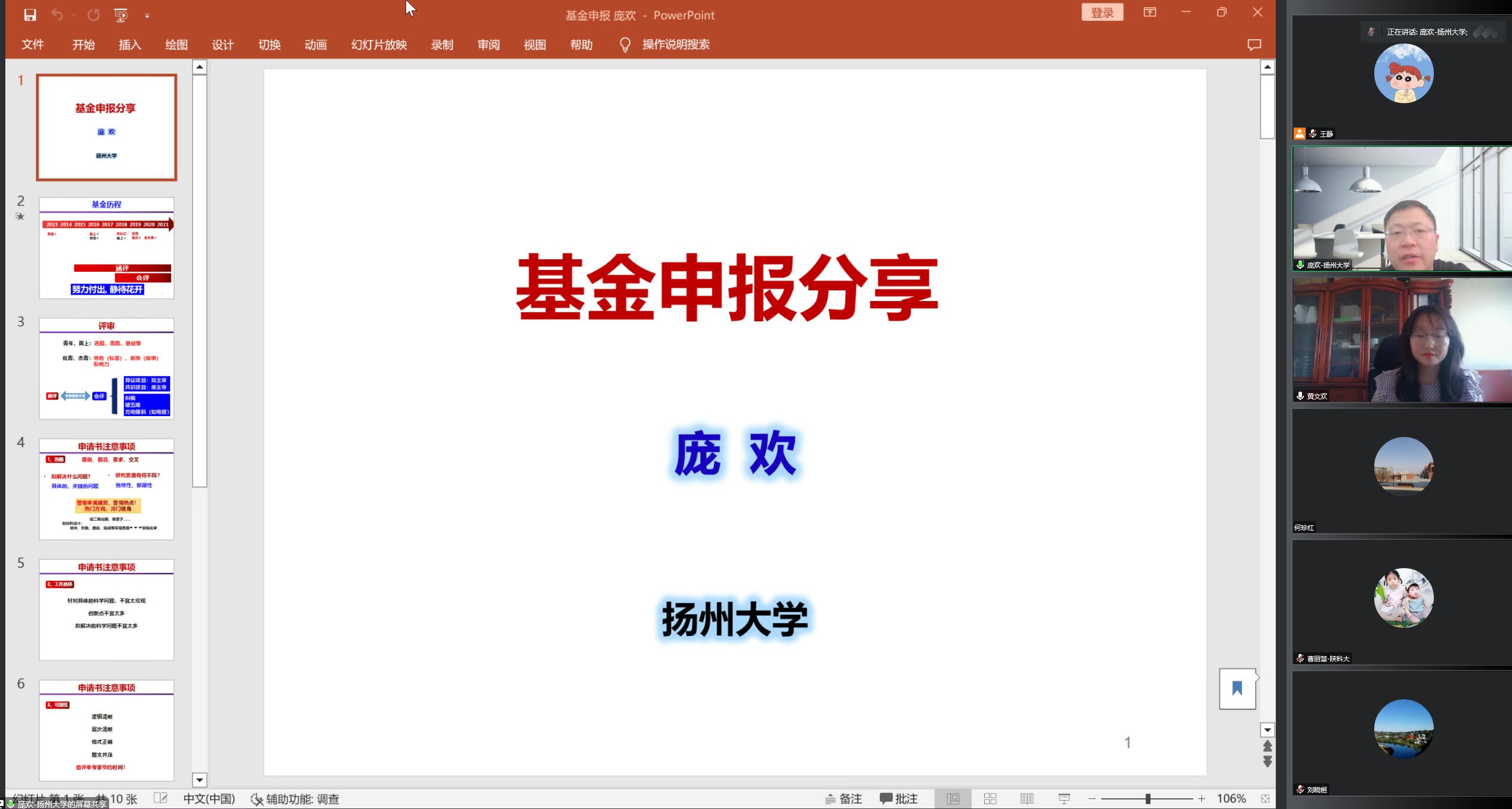 為切實(shí)做好化學(xué)與化工學(xué)院2023年國(guó)家自然科學(xué)基金申報(bào)工作,提高國(guó)家自然科學(xué)基金撰寫(xiě)與申報(bào)水平,1月7日受我??萍继帯⒒W(xué)院邀請(qǐng),揚(yáng)州大學(xué)龐歡教授做客我校“前沿科學(xué)報(bào)告”,為我校師生帶來(lái)題目為“基金申報(bào)分享”的線上報(bào)告。學(xué)院相關(guān)教師參加了此次報(bào)告。