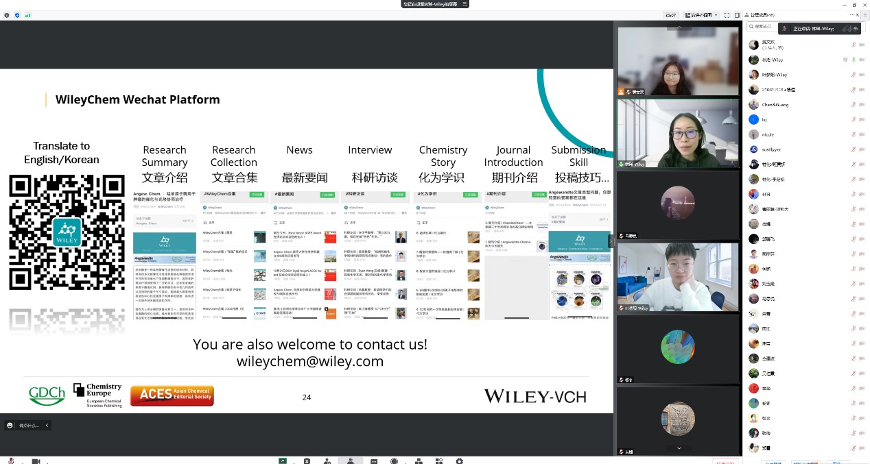 1月11日受我??萍继?、化學(xué)與化工學(xué)院邀請(qǐng),Wiley期刊編輯葉夢(mèng)陽(yáng)博士和林瑤博士做客我?!扒把乜茖W(xué)報(bào)告”,為我校師生帶來(lái)題目為“Publishing with Wiley Chemistry Journals”的線上報(bào)告?;W(xué)院相關(guān)教師參加了此次報(bào)告。