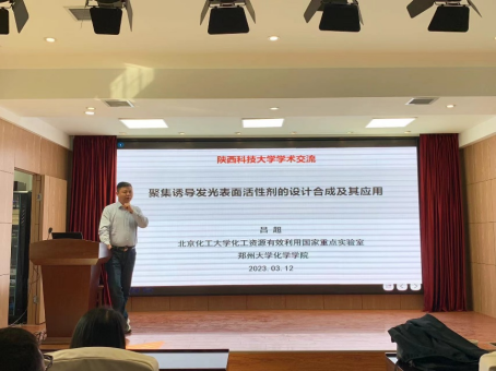 3月12日15點,應我校輕工科學與工程學院(柔性電子學院)、科技處及前沿院邀請,北京化工大學/鄭州大學呂超教授和北京化工大學田銳副教授分別做客我?!扒把乜茖W報告”和“未央導師論壇”,做了題為“聚集誘導發(fā)光表面活性劑的設計合成及其應用”和“基于化學發(fā)光對聚合物降解過程的原位分析及路徑檢測”的學術報告。報告由輕工學院院長呂斌主持,學院相關專業(yè)教師、研究生參加了此次報告會。