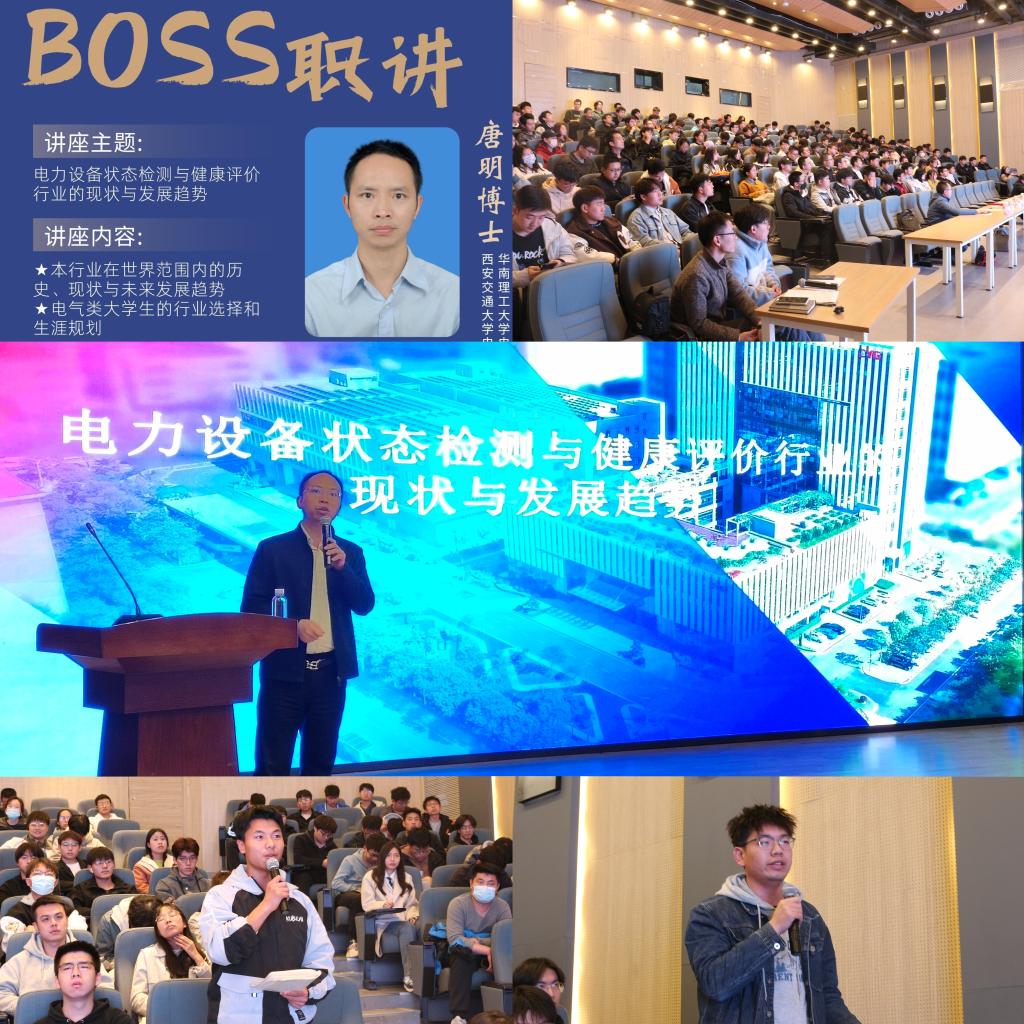報(bào)告會(huì)上,唐明做了主題為《電力設(shè)備狀態(tài)檢測與健康評價(jià)行業(yè)的現(xiàn)狀與發(fā)展趨勢》的報(bào)告,梳理了電力設(shè)備檢測與健康狀態(tài)評價(jià)行業(yè)在世界范圍內(nèi)的歷史、現(xiàn)狀與未來的發(fā)展趨勢,重點(diǎn)探討了其中存在的科學(xué)問題、技術(shù)問題與工程問題,并就“如何把自身發(fā)展和行業(yè)前景相結(jié)合,有趣的規(guī)劃職業(yè)生涯”給出合理化建議。講座深入淺出,內(nèi)容詳實(shí),現(xiàn)場交流環(huán)節(jié)氣氛熱烈。唐明以自己的學(xué)術(shù)成長道路和行業(yè)創(chuàng)新實(shí)踐勉勵(lì)同學(xué)們要夯實(shí)專業(yè)基礎(chǔ)、積極思考、自信自強(qiáng),將電氣行業(yè)的發(fā)展與個(gè)人理想緊密結(jié)合。