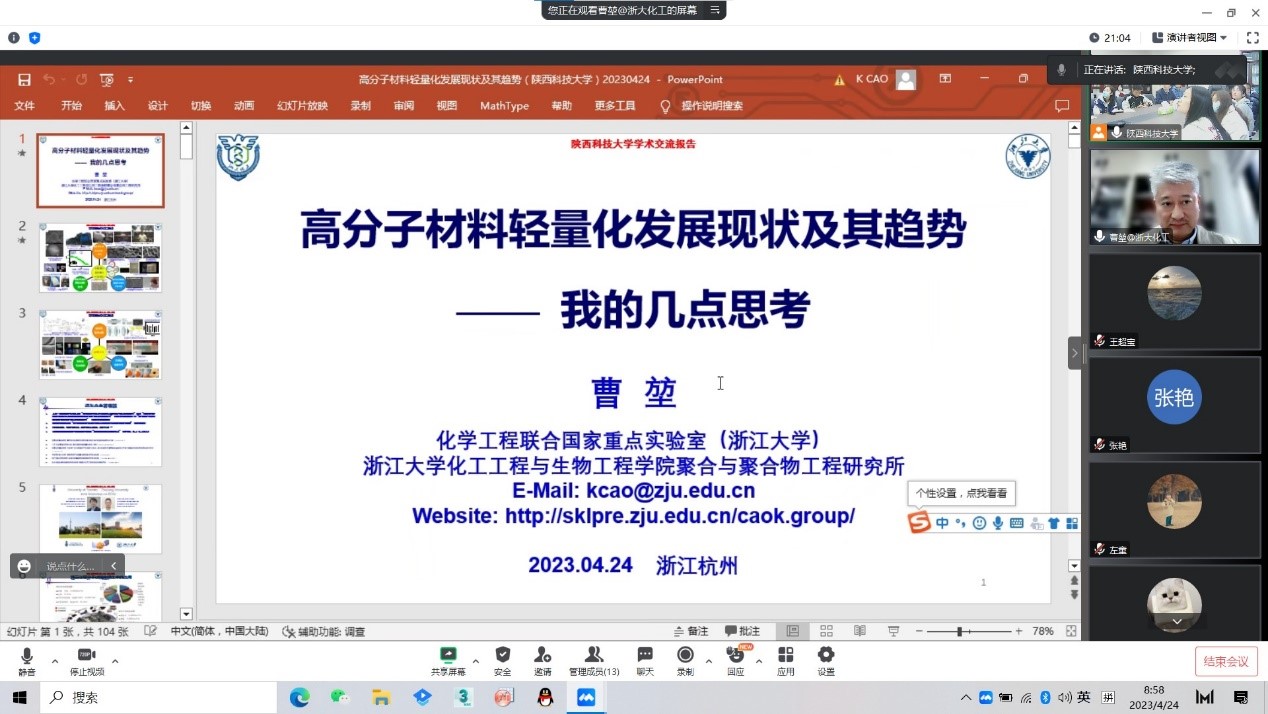 4月24日,受我??萍继?、化學與化工學院邀請,浙江大學曹堃教授做客我?!扒把乜茖W報告”,為我校師生帶來題目為“高分子材料輕量化發(fā)展現(xiàn)狀及其趨勢”的線上報告。報告由教務處副處長、化工學院邵亮教授主持,相關專業(yè)教師、研究生和本科生參加了此次報告。