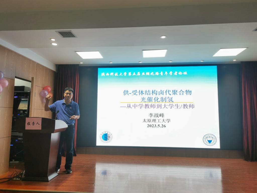 5月26日下午,應(yīng)我校輕工科學(xué)與工程學(xué)院(柔性電子學(xué)院)、科技處及前沿院的邀請(qǐng),太原理工大學(xué)李戰(zhàn)峰教授做客我?!扒把乜茖W(xué)報(bào)告”,作了題為“供-受體結(jié)構(gòu)鹵代聚合物光催化制氫”的學(xué)術(shù)報(bào)告。報(bào)告由輕工學(xué)院副院長(zhǎng)劉國(guó)棟主持,我校相關(guān)專業(yè)教師、研究生參加了此次報(bào)告會(huì)。