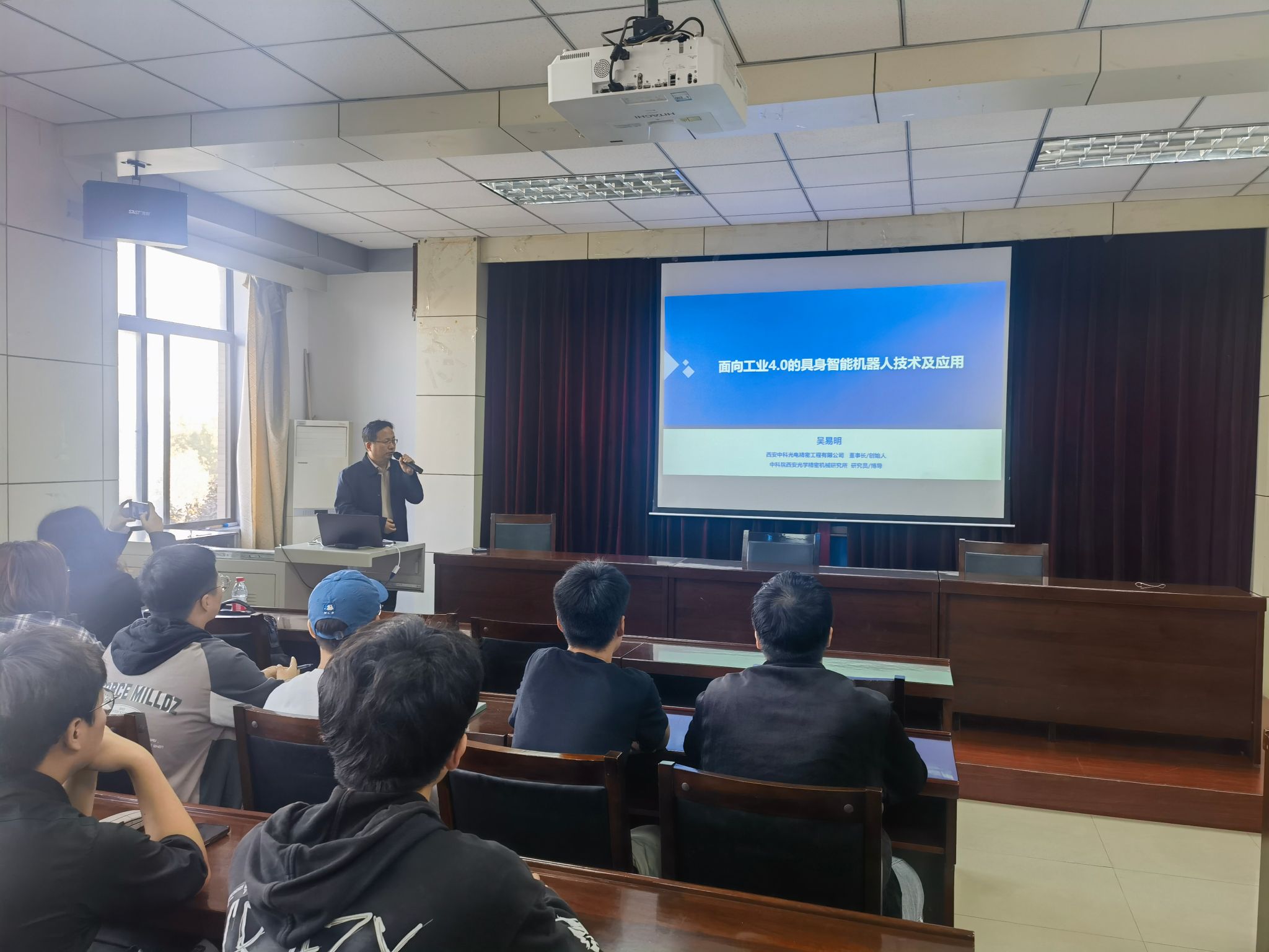 10月30日,受機電工程學院(智能制造與機器人工程學院)邀請,中科院西安光學精密機械研究所吳易明研究員做客我?!拔囱雽熣搲?,做了題為“面向工業(yè)4.0的具身智能機器人技術及應用”的學術報告,機電學院機器人工程專業(yè)的師生參加了報告會,機器人工程教研室主任劉慶立主持報告會。