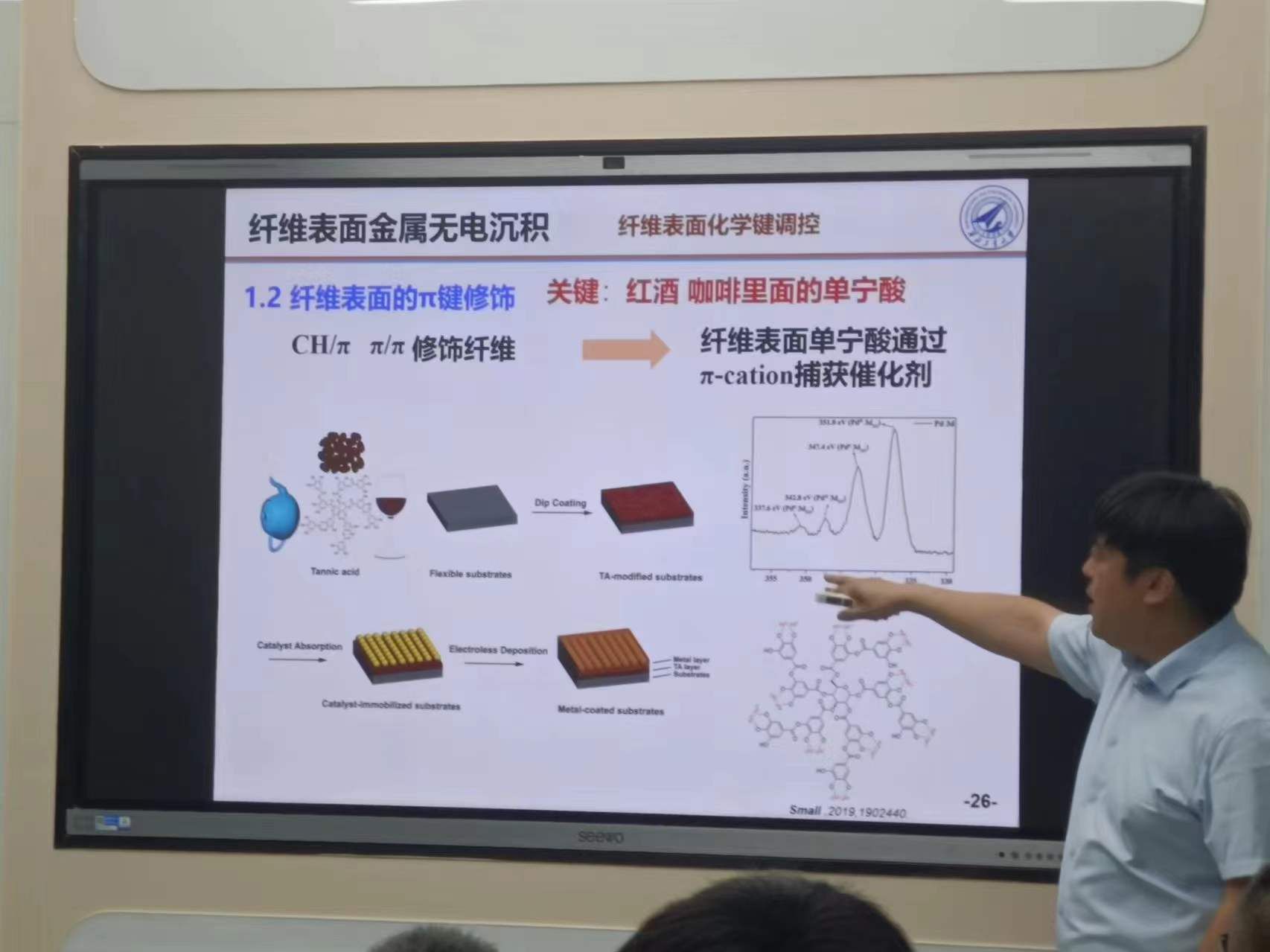 近日,應(yīng)我校科技處、材料科學(xué)與工程學(xué)院(文物保護(hù)科學(xué)與技術(shù)學(xué)院)及前沿院邀請,西北工業(yè)大學(xué)劉旭慶教授做客我?!扒把乜茖W(xué)報(bào)告”,作了題為“纖維表面分子工程和功能性纖維”的學(xué)術(shù)報(bào)告。報(bào)告會由材料學(xué)院宋浩杰教授主持,學(xué)院相關(guān)專業(yè)師生參加了此次報(bào)告會。