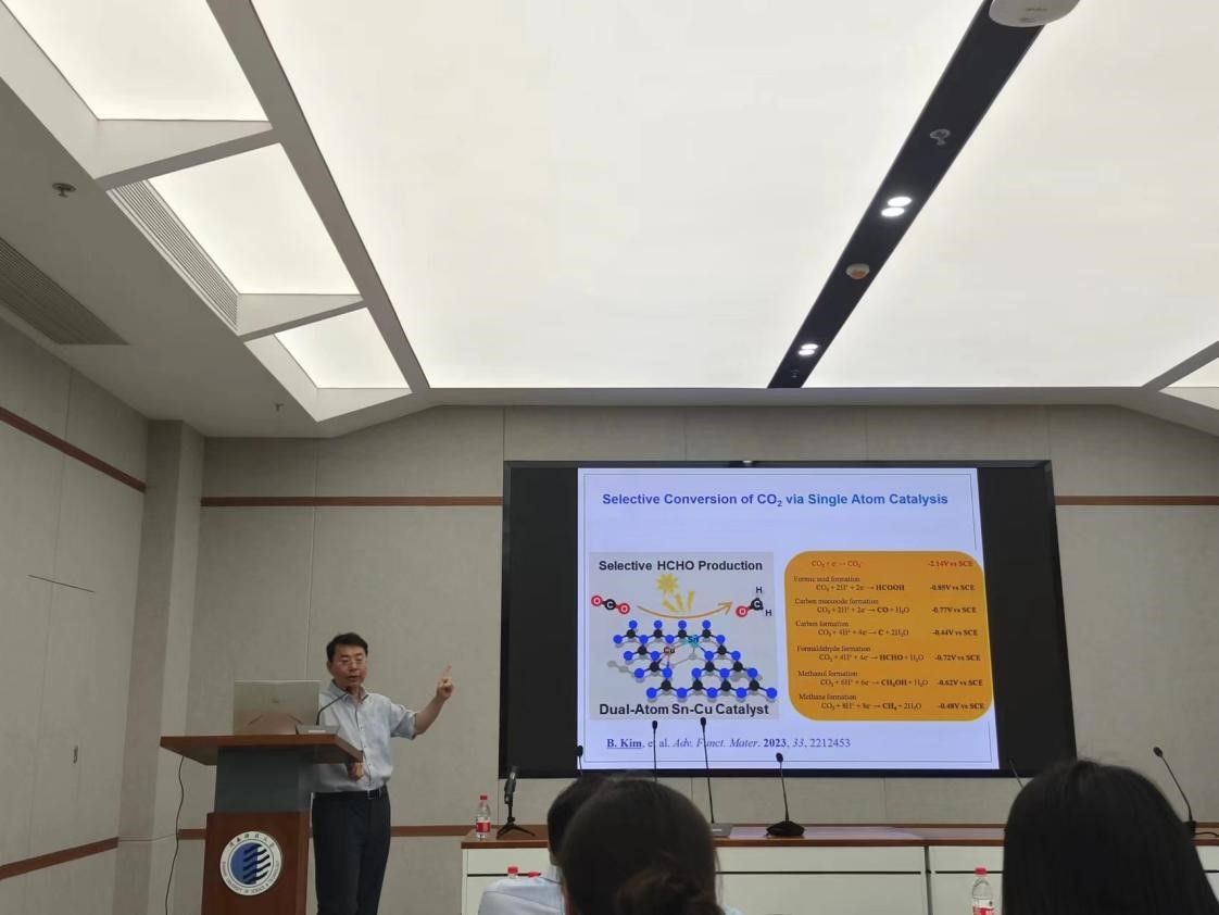 報告會上,Wonyong Choi教授首先說明了太陽能及光(電)催化在實現(xiàn)自然界各種化學元素(如C、N、O和H)可持續(xù)循環(huán)中扮演著重要角色;其次,Wonyong Choi教授圍繞C、N和O等小分子化合物的光催化/光電化學(PEC)轉(zhuǎn)化,介紹了各種工程化光(電)催化系統(tǒng),其可實現(xiàn)NO3?、NO2?、NO、NH4?和 N2的選擇性轉(zhuǎn)化;隨后,詳細描述了通過O2還原可持續(xù)生產(chǎn)H2O2的光催化/光電化學系統(tǒng),其在無偏壓條件下能夠連續(xù)生產(chǎn)H2O2超過100小時;最后,Wonyong Choi教授舉例說明了使用異核雙原子位點催化劑控制CO2轉(zhuǎn)化的多電子轉(zhuǎn)移機制。