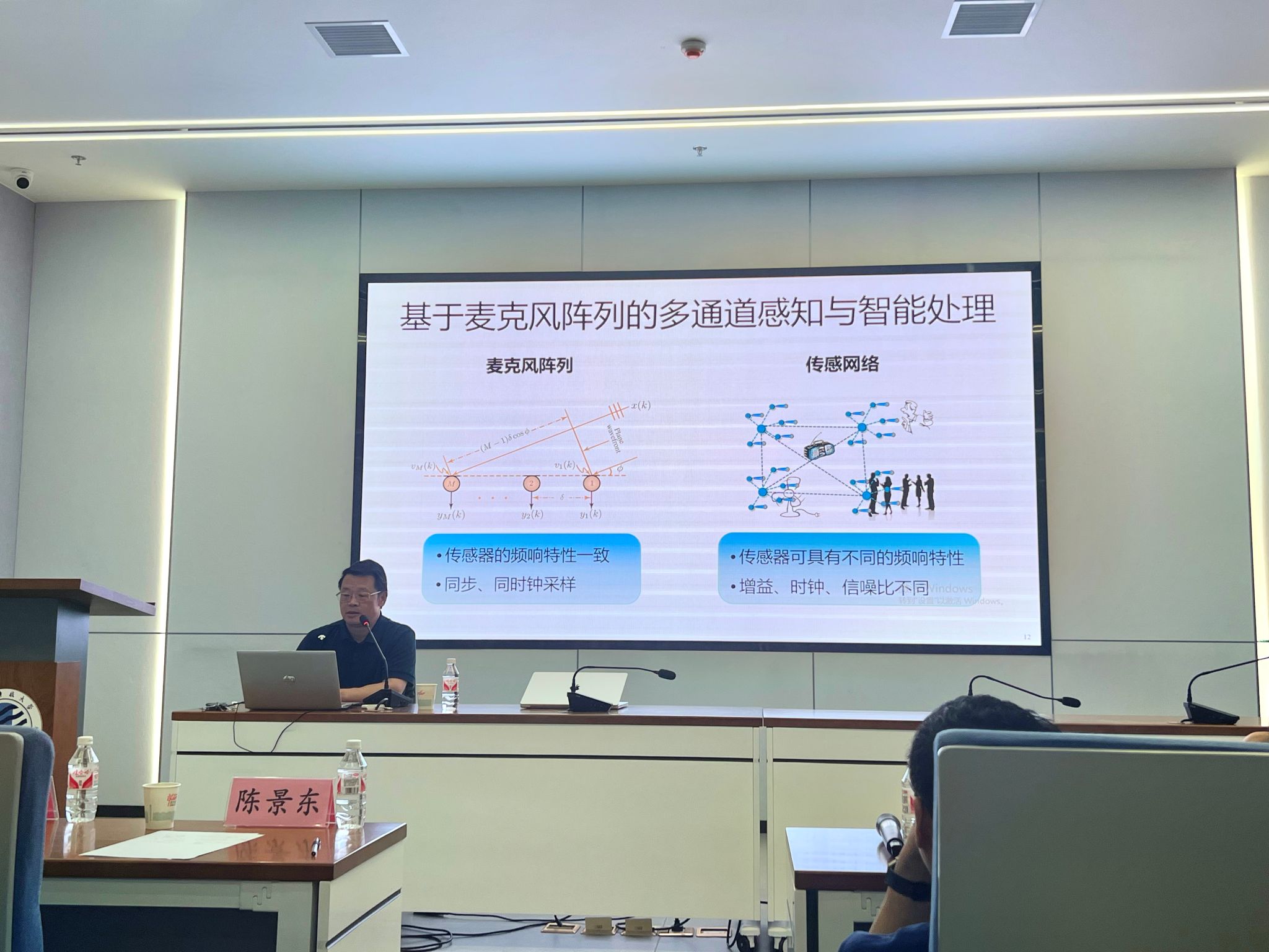 聲信號(hào)獲取與處理技術(shù)是語(yǔ)音通信和人機(jī)語(yǔ)音交互的基石。在本次報(bào)告中,陳景東教授首先介紹了日常生活中的常見(jiàn)噪聲類(lèi)型,及遠(yuǎn)程會(huì)議、錄音擴(kuò)放、智能家居、智能座艙等領(lǐng)域的應(yīng)用場(chǎng)景,并從單通道語(yǔ)音信號(hào)處理的局限性引出了多通道語(yǔ)音信號(hào)處理任務(wù),指出了下一代拾音系統(tǒng)不僅需要獲取來(lái)自某些聲源的聲信號(hào),也需要感知傳感器周?chē)穆晥?chǎng)信息,以實(shí)現(xiàn)場(chǎng)景檢測(cè)、聲事件分類(lèi)、識(shí)別與解譯等任務(wù)。報(bào)告中,陳景東教授就聲信號(hào)獲取、聲場(chǎng)感知技術(shù)的進(jìn)展,以及多通道聲場(chǎng)感知與智能處理領(lǐng)域所面臨的主要挑戰(zhàn)等問(wèn)題作了深入淺出地介紹。報(bào)告結(jié)束后,陳景東教授認(rèn)真詳細(xì)的回答了現(xiàn)場(chǎng)老師和學(xué)生的問(wèn)題。