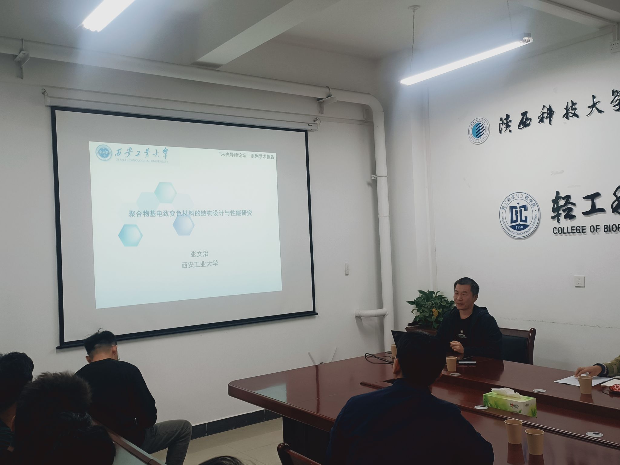 2024年10月23日下午,應(yīng)我校輕工科學(xué)與工程學(xué)院(柔性電子學(xué)院)和研究生院邀請,西安科技大學(xué)熊善新教授和西安工業(yè)大學(xué)張文治副教授做客我?!拔囱雽?dǎo)師論壇”,分別做了題為“共價有機(jī)框架光電功能材料與器件”和“聚合物基電致變色材料的結(jié)構(gòu)設(shè)計與性能研究”的學(xué)術(shù)報告,報告會由輕工學(xué)院院長呂斌主持,學(xué)院相關(guān)專業(yè)教師和研究生參加了本次報告會。
