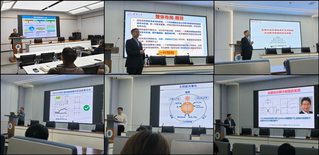 朱永法教授介紹了其研究團隊在有機半導體光催化劑設(shè)計、合成及應(yīng)用的新進展,包括成功構(gòu)筑了PDI、卟啉、HOF等系列超分子和聚合物光催化劑,在可見光下實現(xiàn)了優(yōu)異的污染物降解和高效礦化性能,同時,還具有優(yōu)異的可見光分解水產(chǎn)氫和產(chǎn)氧活性以及將CO2還原到C2產(chǎn)物的能力,為有機半導體光催化劑在環(huán)境和能源領(lǐng)域的應(yīng)用提供了重要借鑒。此外,朱教授還就國家自然科學基金申請書的寫作思路、申報注意事項等進行了細致輔導,助力我校在國家科學基金方面的新發(fā)展。
